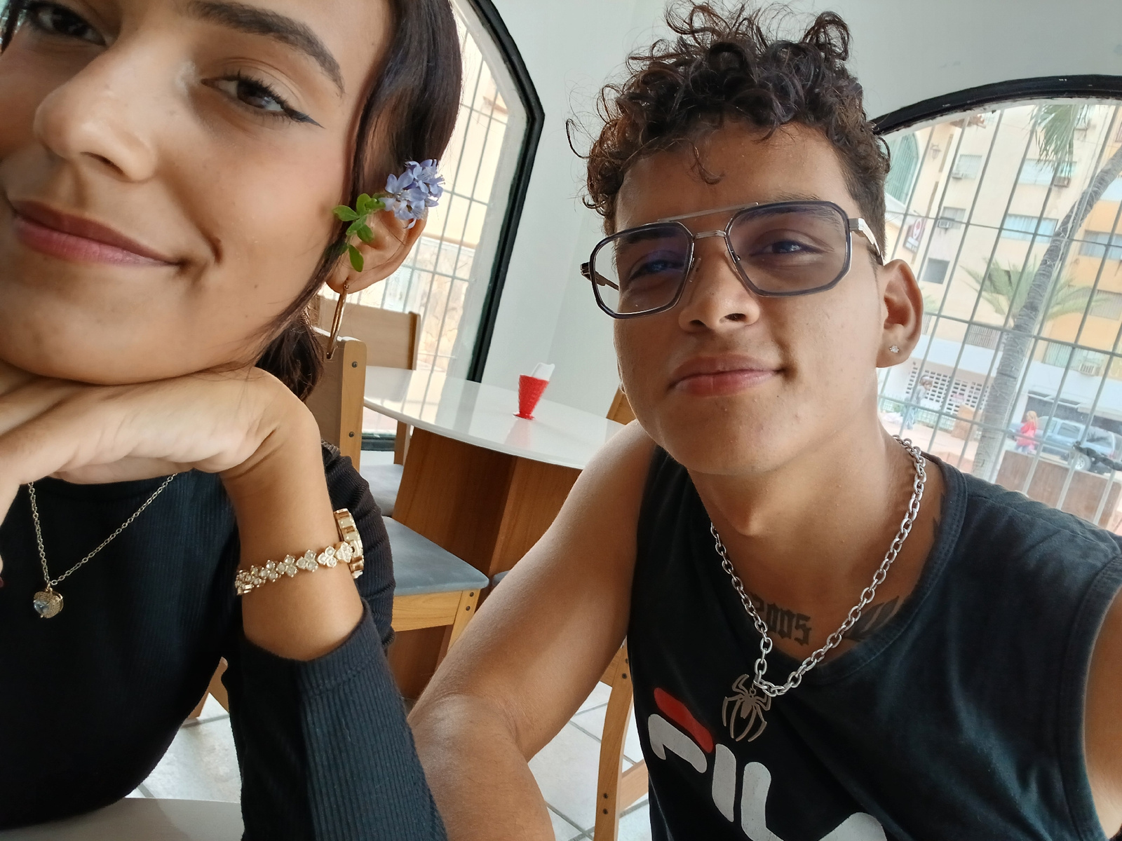 A close-up selfie shows two people indoors. On the left is a person with dark hair and brown eyes, wearing a black top, a necklace with a heart pendant, and a jeweled bracelet. They have a small blue…read more