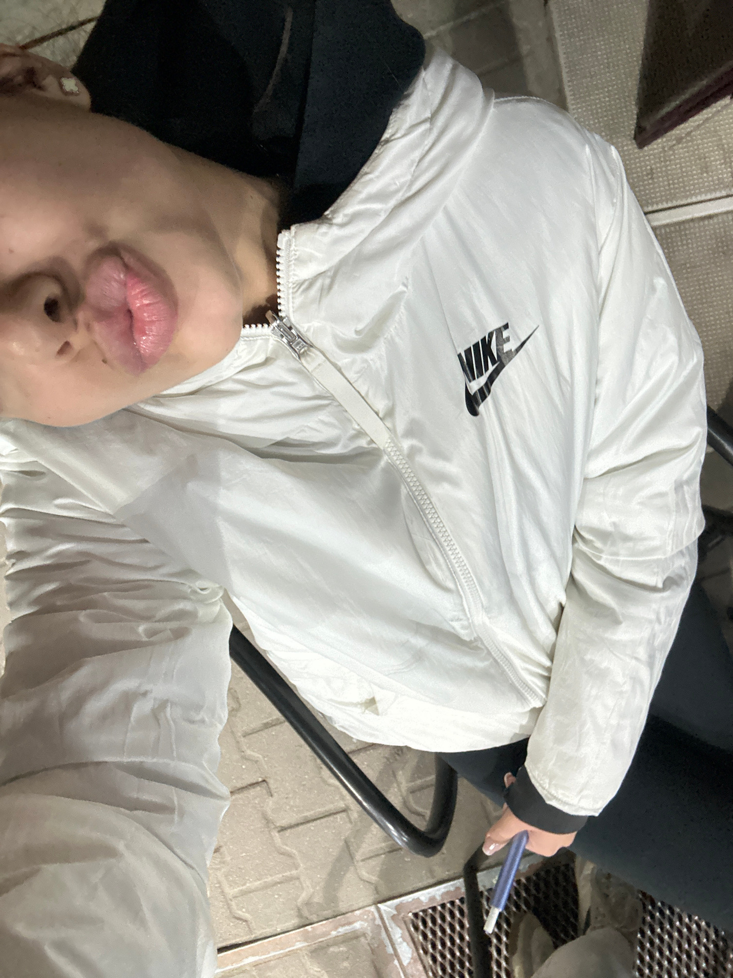A selfie, taken from a slightly overhead perspective, captures a person wearing a white Nike puffer jacket. The jacket is partially zipped and features the Nike logo prominently on the left breast. Th…read more