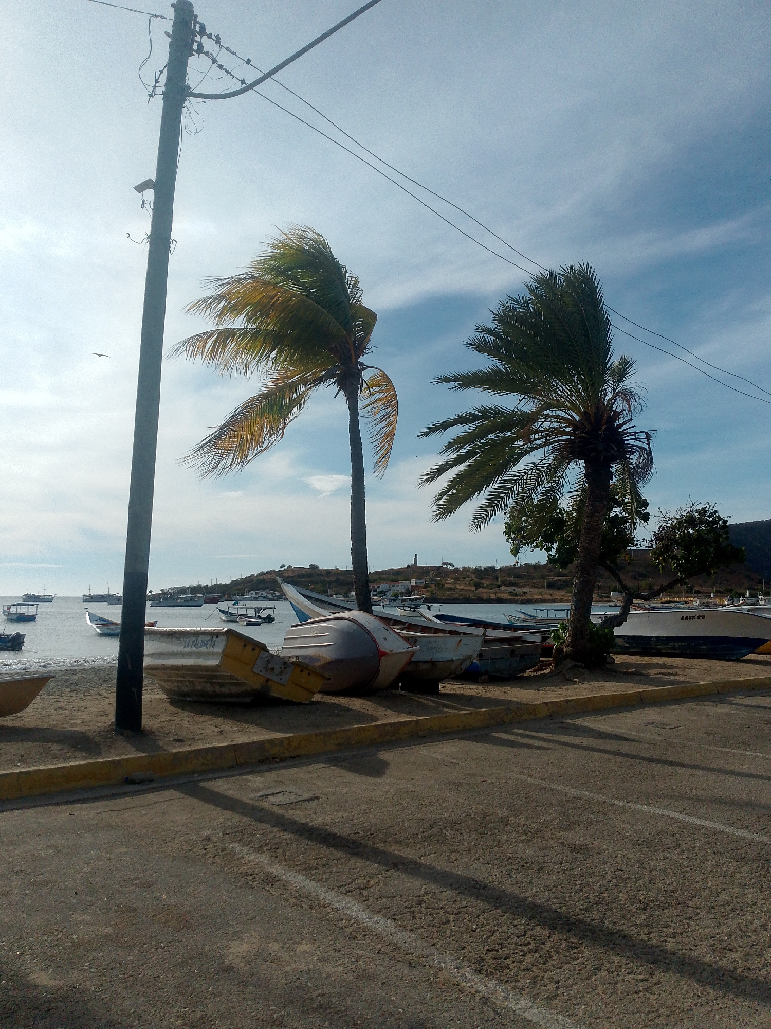 The image shows a coastal scene in Juan Griego, Venezuela. Two palm trees stand between the beach and a paved road. The left palm tree is bent in the wind. Several fishing boats are beached on the san…read more