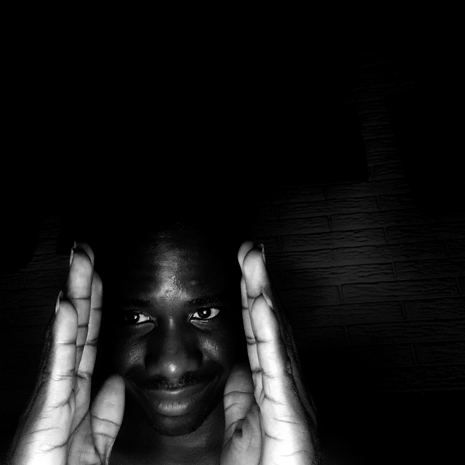 A black and white, close-up, eye-level shot shows a person with dark skin lying down and looking up. The person's face is framed by their own hands, which are positioned above and below the face. The…read more