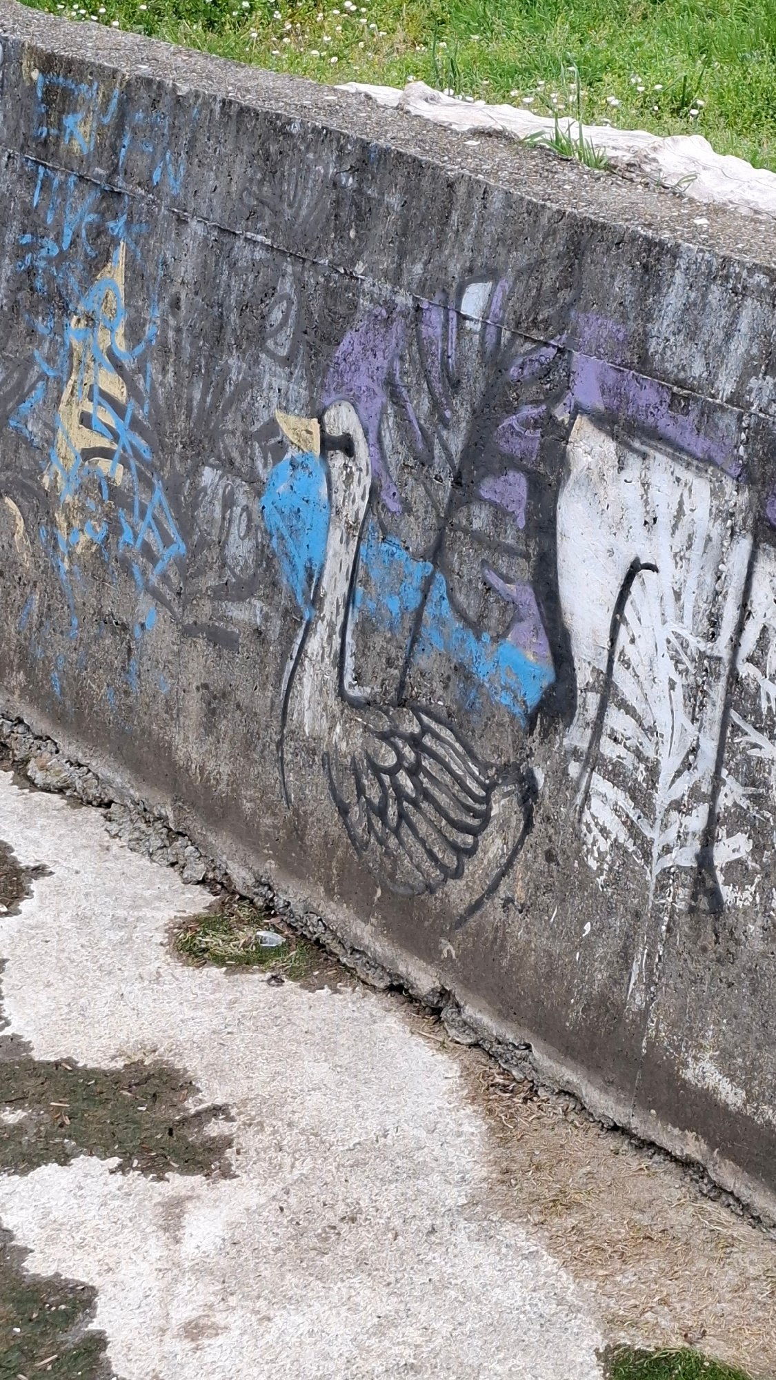 A concrete wall with graffiti, situated near a grassy area, likely in Budva, Montenegro. The graffiti features blue and purple paint, including an image resembling a bird. There is also abstract white…read more