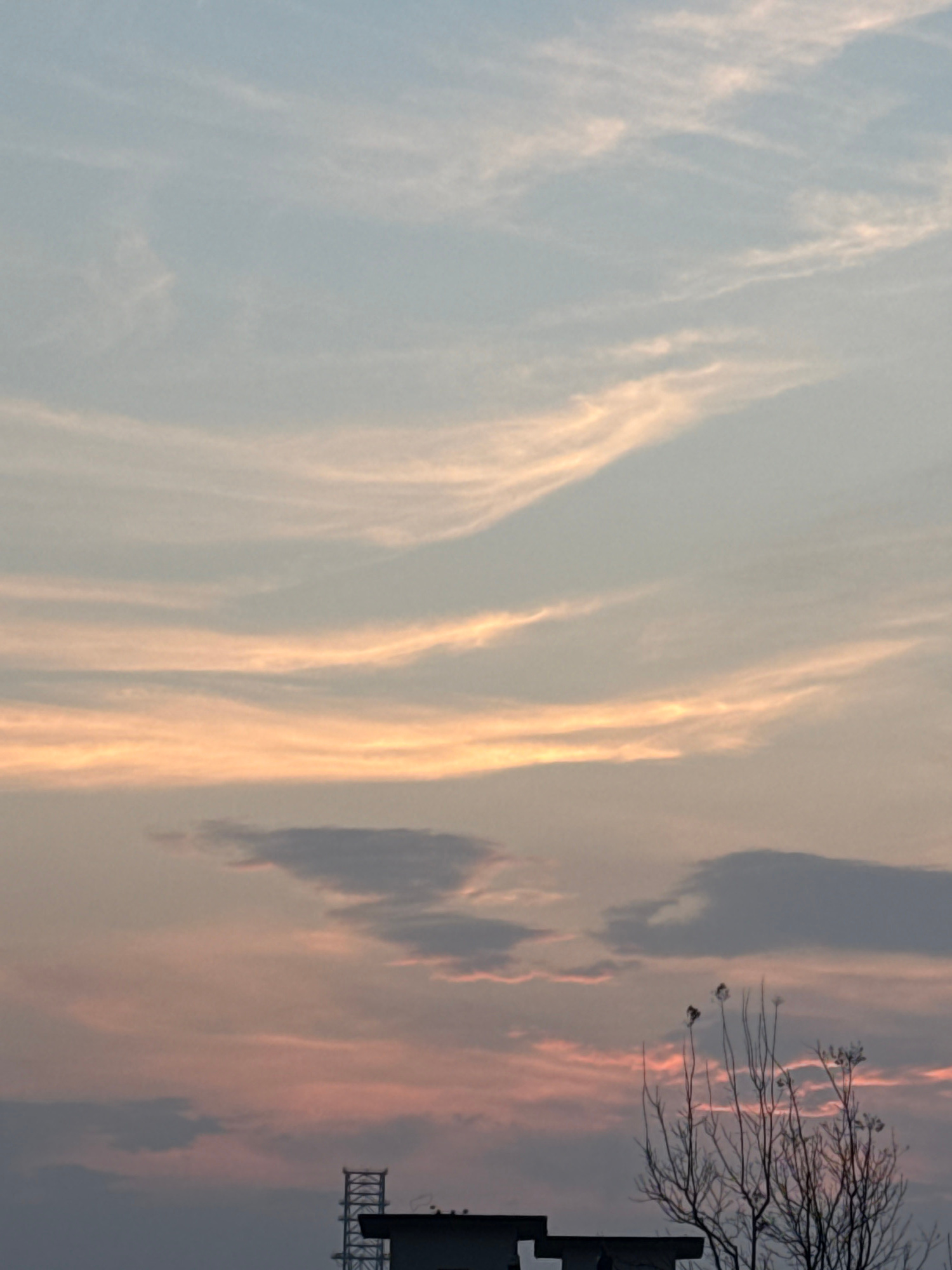 A nighttime shot of the sky in Zhongtun, China. The sky is a pale blue on the left, transitioning to a deep grey and light red on the right. Wispy clouds stretch vertically across the sky. Silhouetted…read more