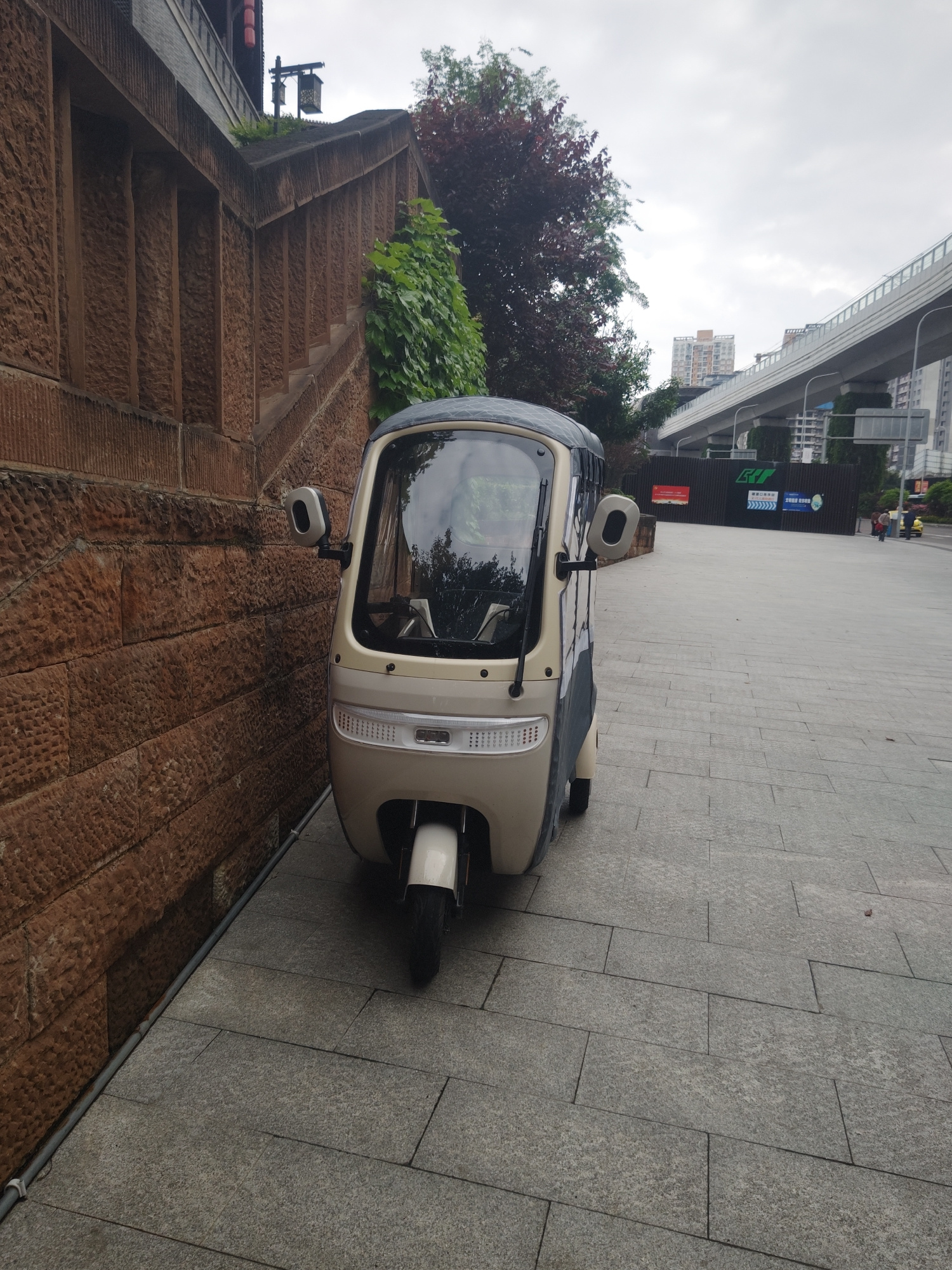 A motorized tricycle is parked on a stone-tiled walkway adjacent to a brown stone wall with stairs. The tricycle is light beige and black with a windshield and two side mirrors. Above the wall is gree…read more