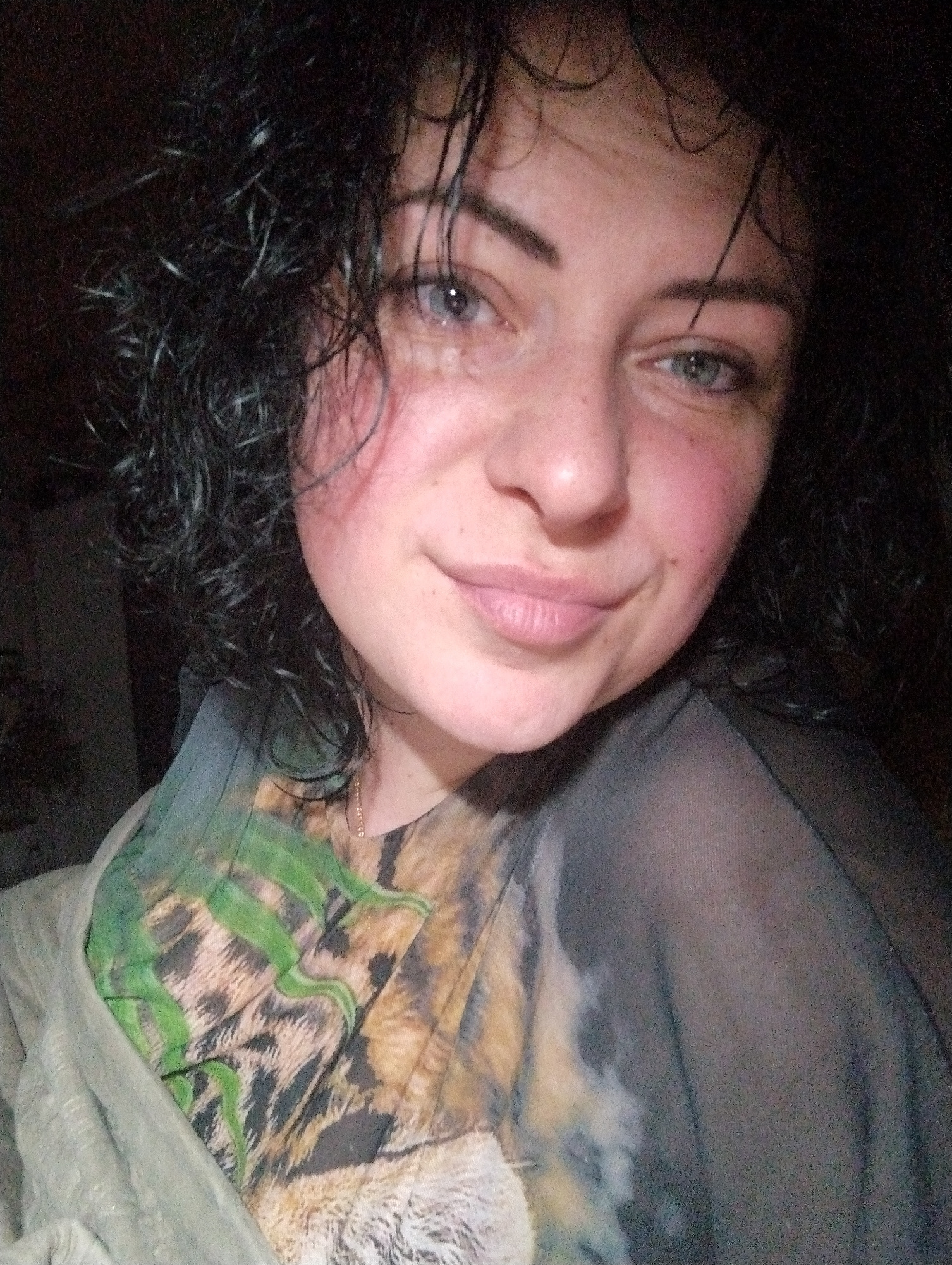 A person with wet, dark, curly hair and pale skin is facing the camera. The person's eyes are light-colored. They have a slight smile. The person is wearing a t-shirt with a tiger print and a light green garment draped over their shoulder. The background is dark. There is insufficient information to confirm the location in the city of Grishanki, Russia. | Open Wire