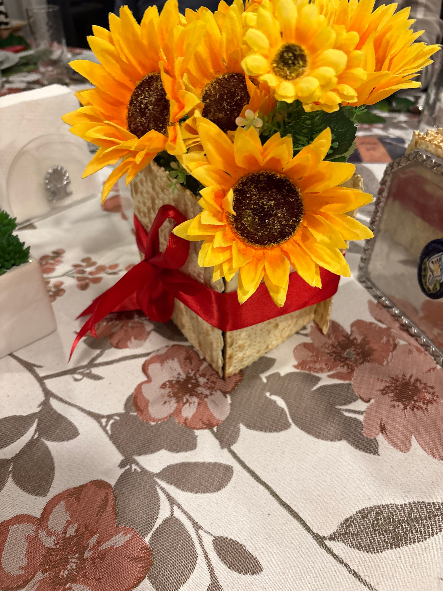 The image shows a still life arrangement on a floral patterned tablecloth. A bunch of yellow sunflowers is prominent, positioned towards the left side. Next to the sunflowers is a stack of matzah tied…read more