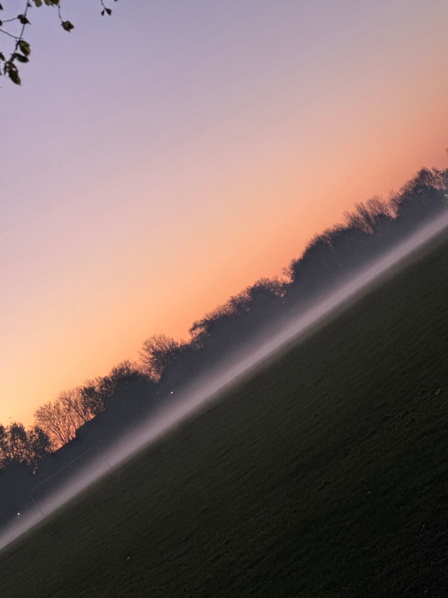 The image depicts a grassy field in London, United Kingdom, separated from a line of trees by a band of fog. In the background, the sky transitions from orange near the trees to a light purple at the…read more