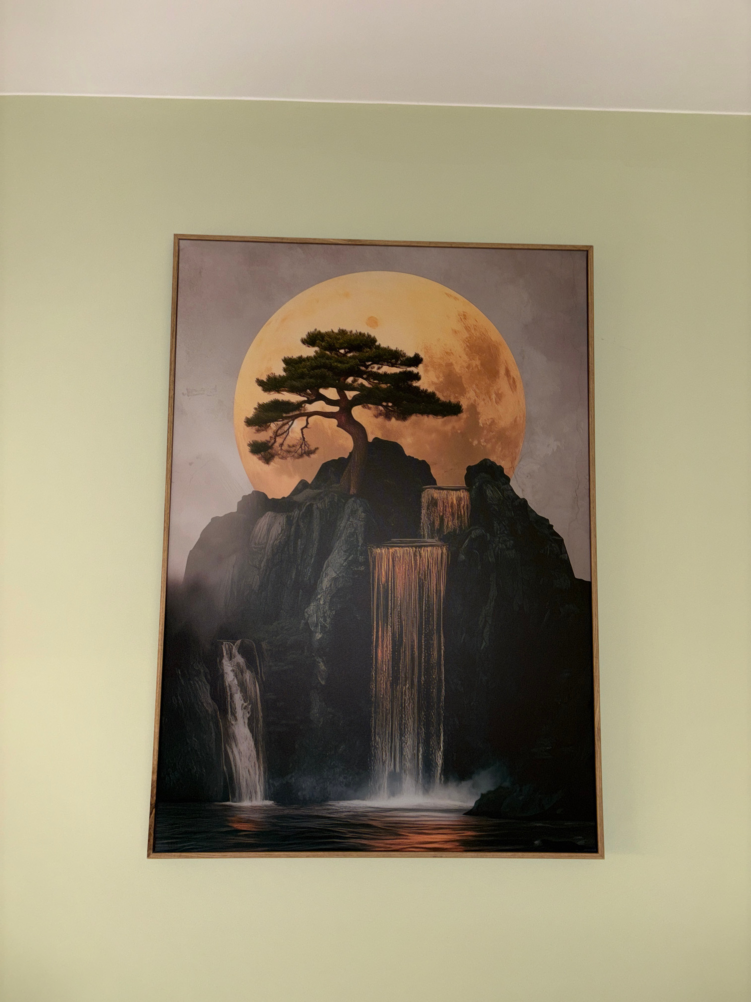 A framed artwork hangs on a light yellow wall. The artwork depicts a scene with a large, pale orange moon behind a tree and a waterfall cascading down a dark, rocky cliff. The artwork is rectangular w…read more