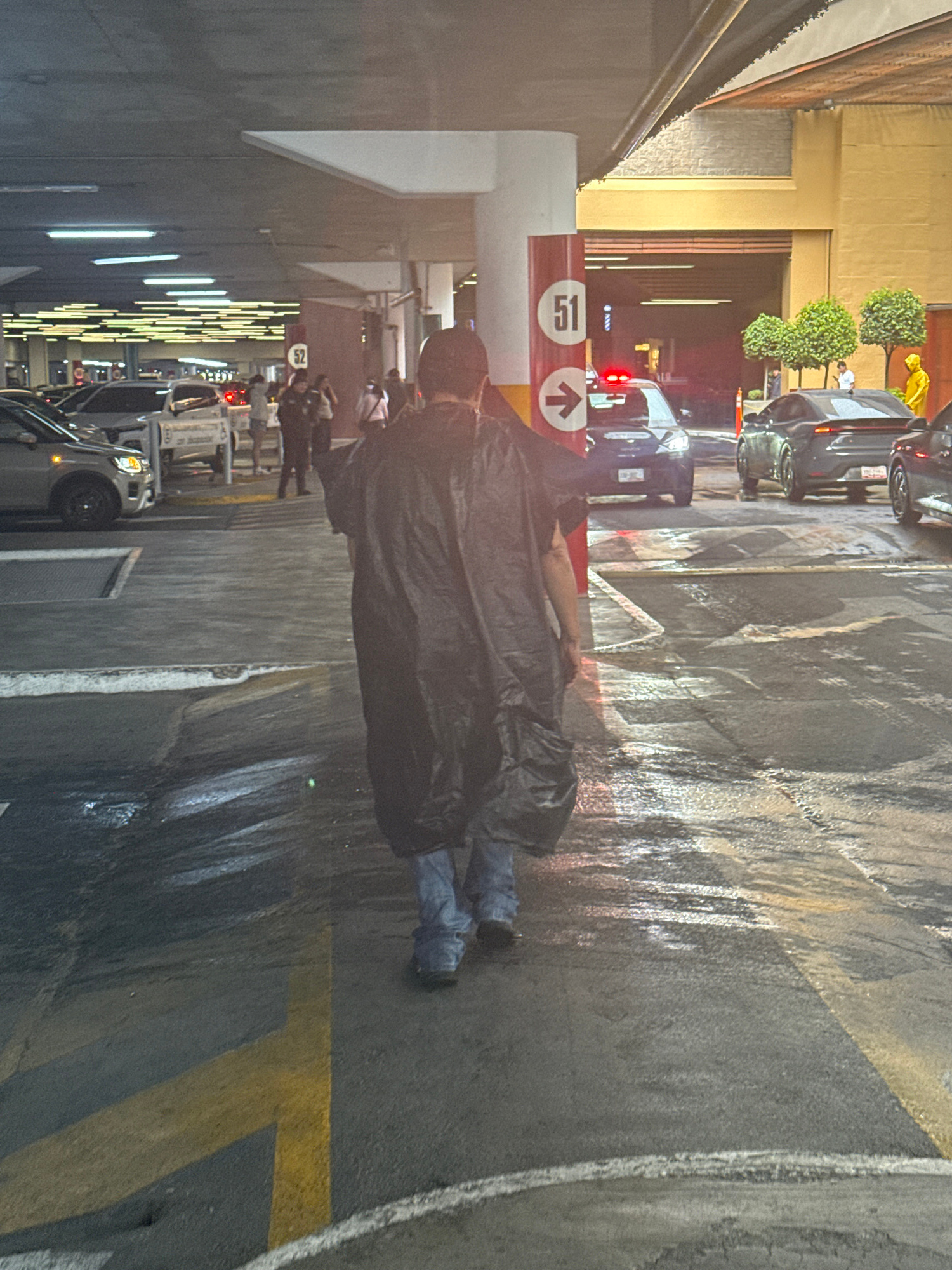 The image captures a rainy scene inside a parking garage in Puebla, Mexico. A person wearing a black raincoat is walking on the wet asphalt floor. Cars are parked nearby, and other people are visible…read more