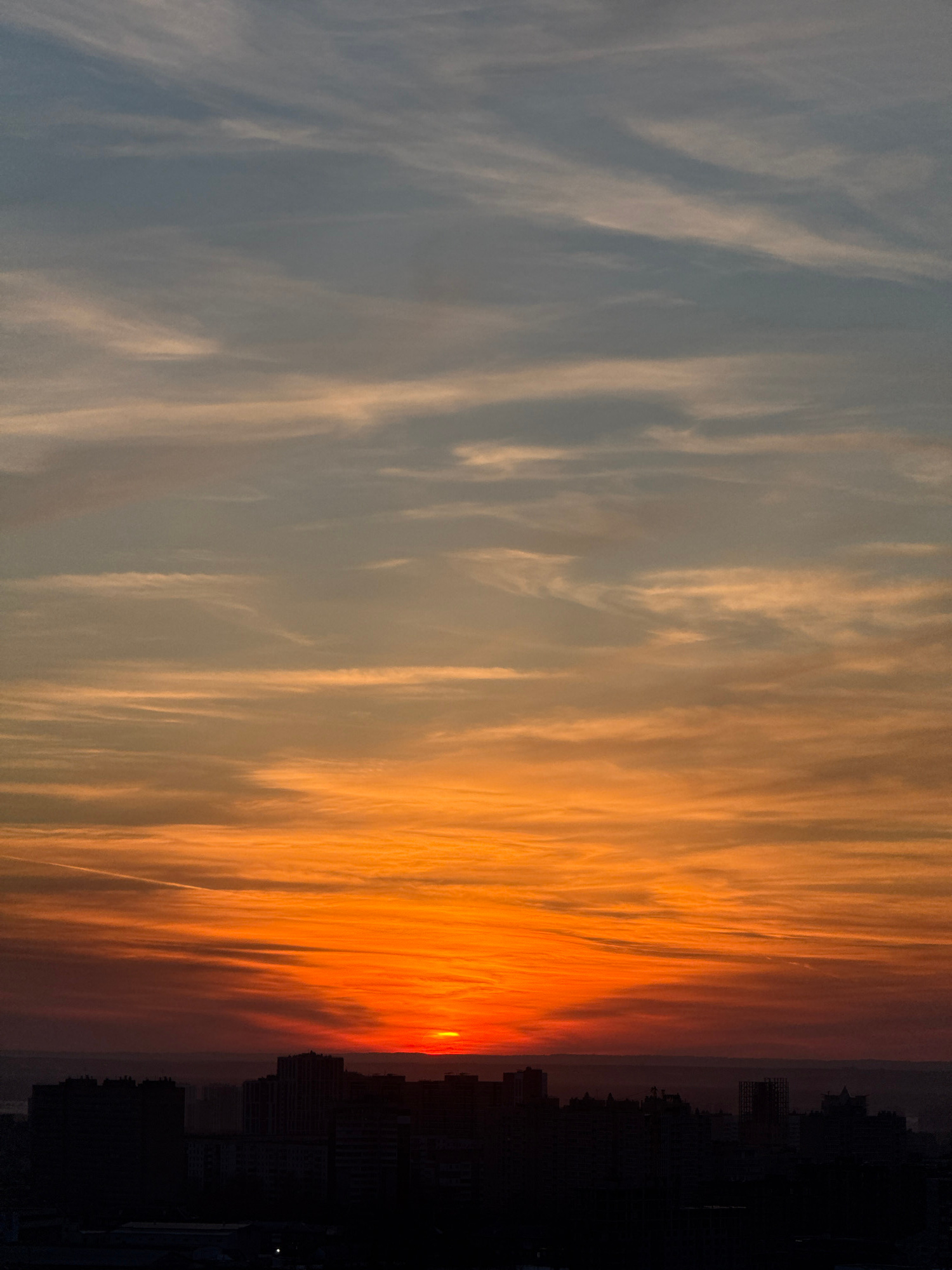This image depicts an urban sunset or sunrise over the city of Perm, Russia, observed from an elevated vantage point. The sky occupies the majority of the frame, displaying a pronounced horizontal gra…read more
