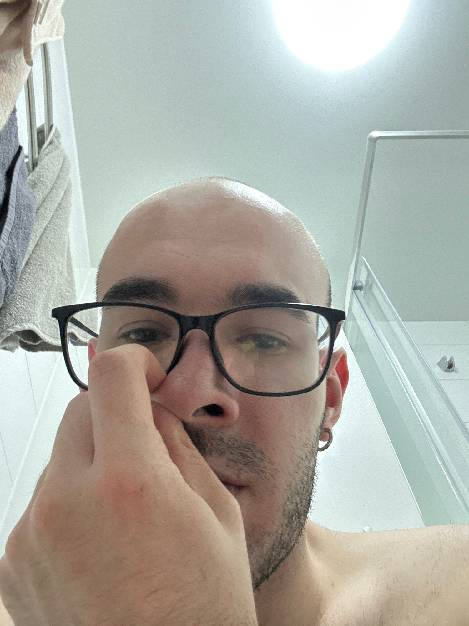 A close-up, tilted selfie of a bald man with glasses, partially obscured by his hand near his nose. The background shows a bathroom setting with a white wall, a shelf, and towels on a rack. There is n…read more