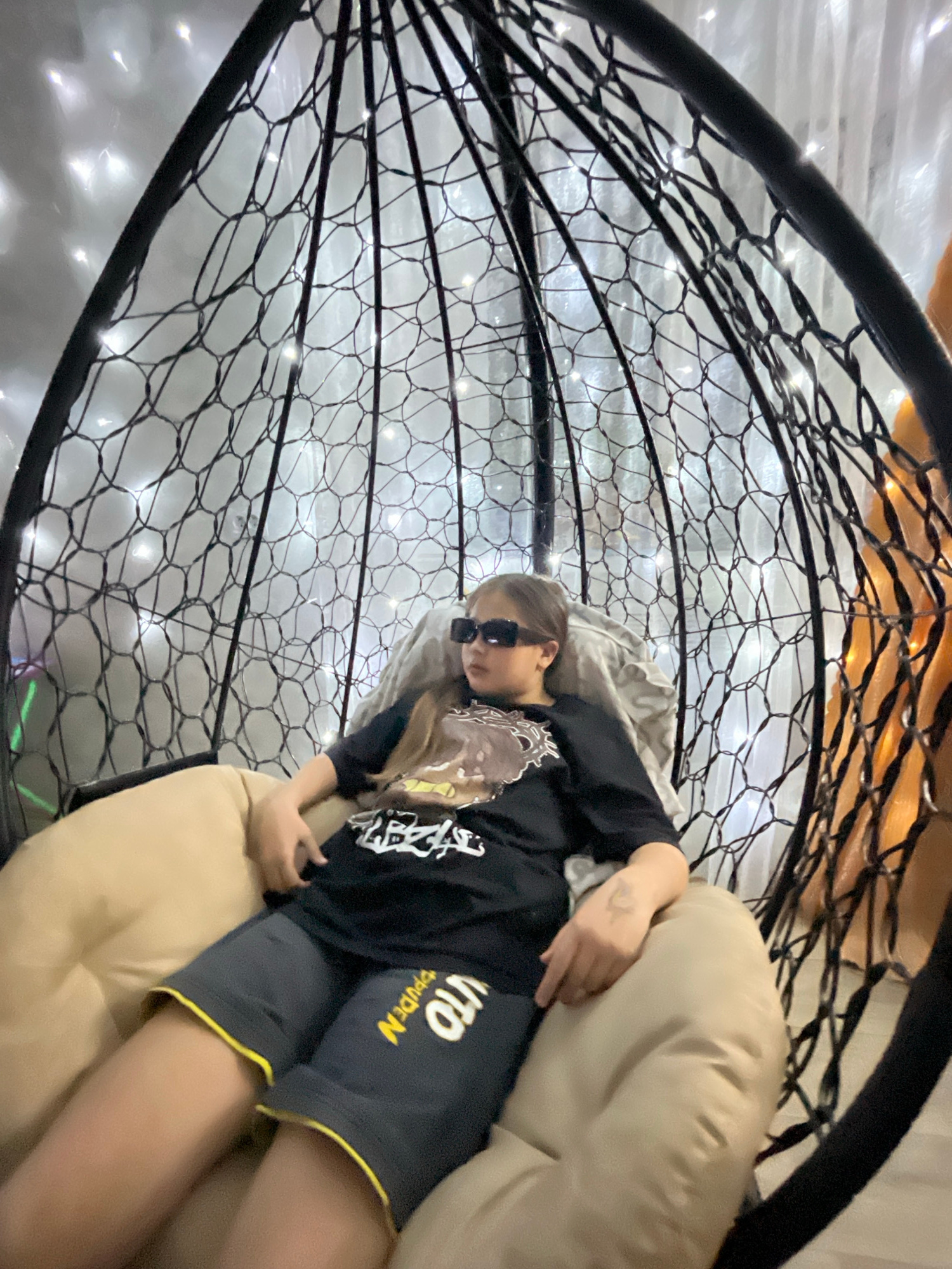 A young person with long hair and sunglasses reclines in a hanging chair, seemingly indoors. The chair's frame is black and woven, adorned with small white lights. The person wears a black long-sleeveβ¦read more