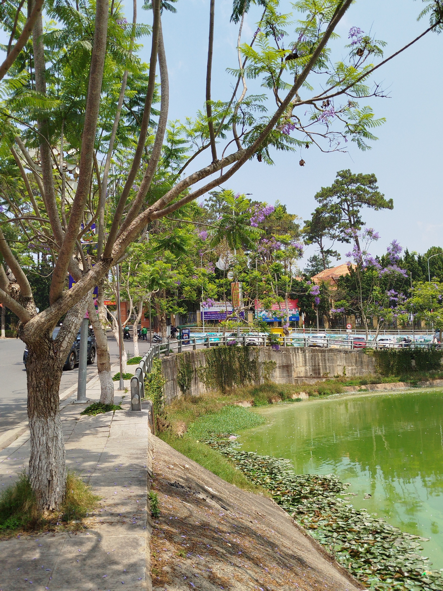 The image depicts a street scene along Xuan Huong Lake in Da Lat, Vietnam. A row of Jacaranda trees line the street, some with trunks painted white. The lake is visible with lily pads and green-tinged…read more