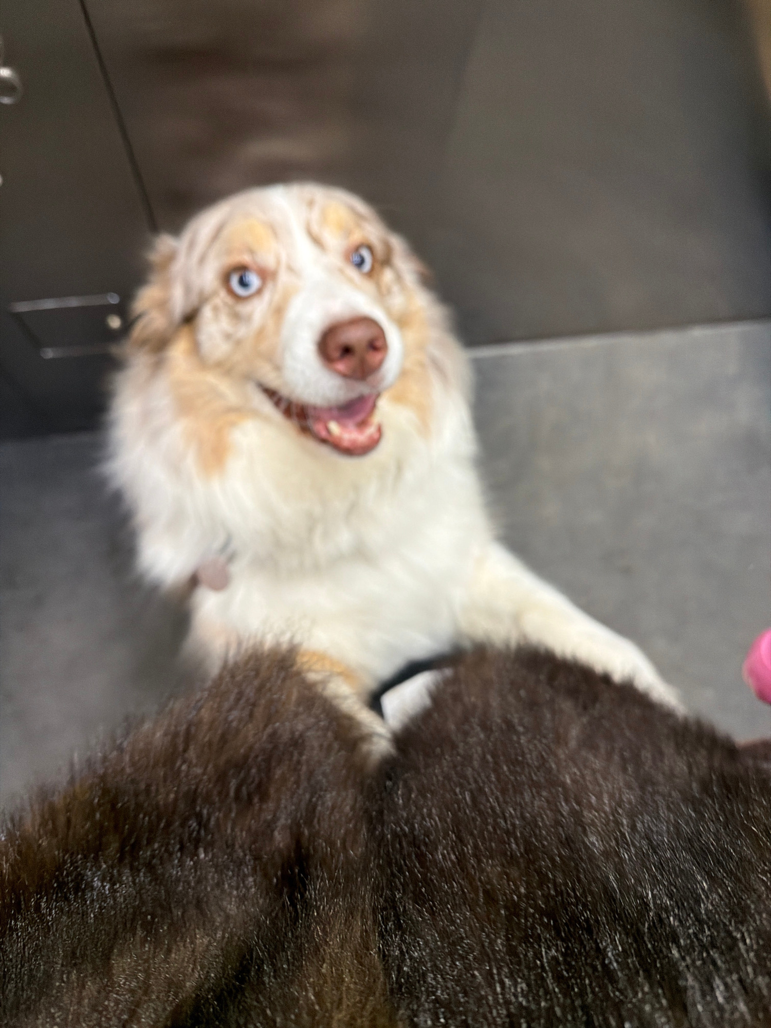 A close-up shot captures a dog, likely an Australian Shepherd given its coloring, lying on what appears to be a dark, possibly metal, grooming table. The dog has light tan and white fur around its fac…read more