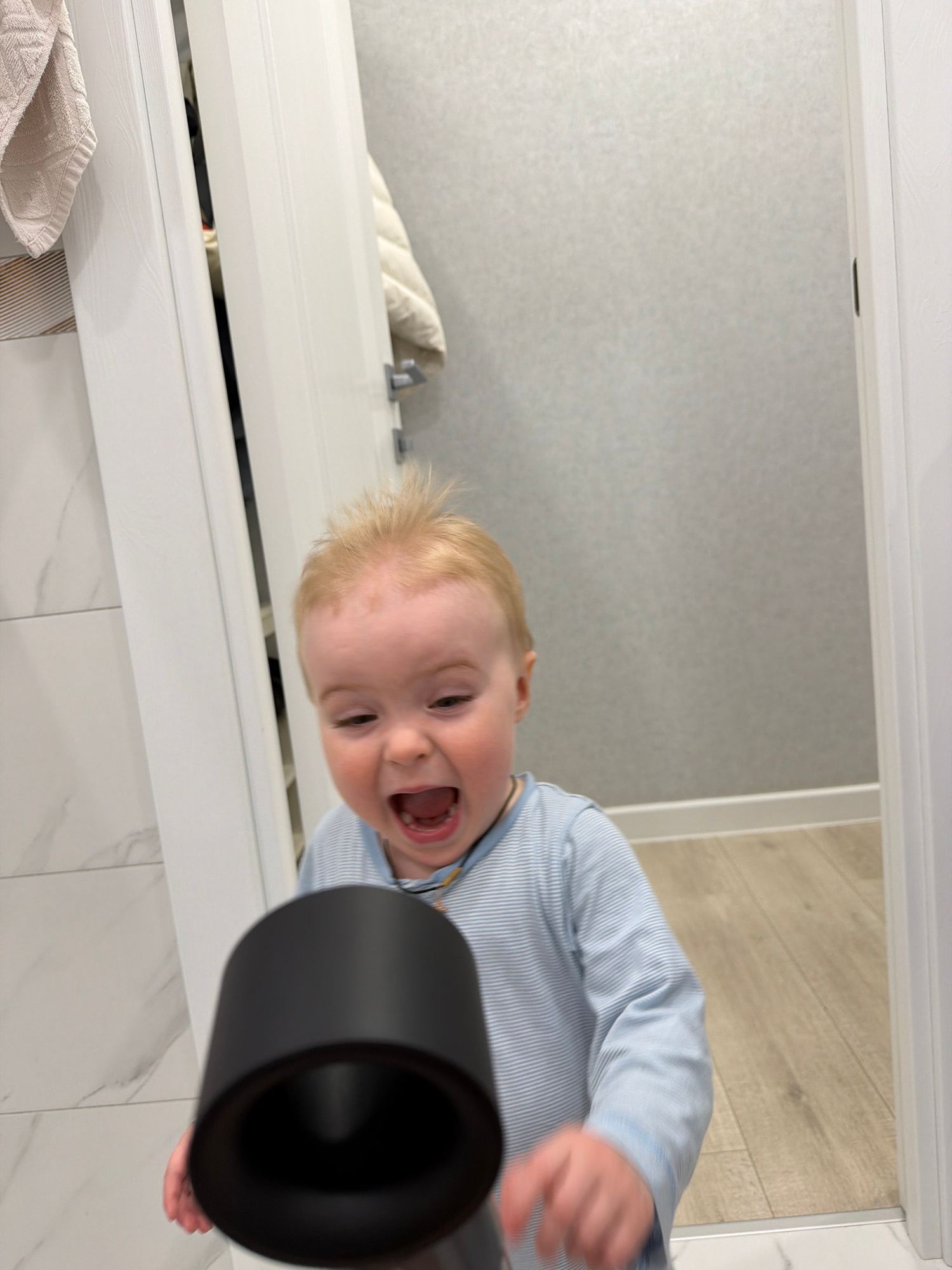 A low-angle, indoor shot captures a toddler in Votkinsk, Russia, as they peer through a doorway. The child has fair skin, blond hair, and wears a light blue and white striped long-sleeved shirt. The toddler's mouth is open in a yell or laugh. A black cylindrical object is held in front of the camera, slightly obscuring the child. The background includes a door frame, a gray wall, and a tiled floor. The doorway leads into a space with a white bathtub and a folded white towel. | Open Wire