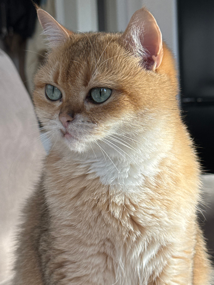 The image captures a close-up of a cat, situated in the city of Bar, Montenegro. The animal features dense, short fur that is predominantly golden-orange, with lighter cream-colored fur present on its…read more