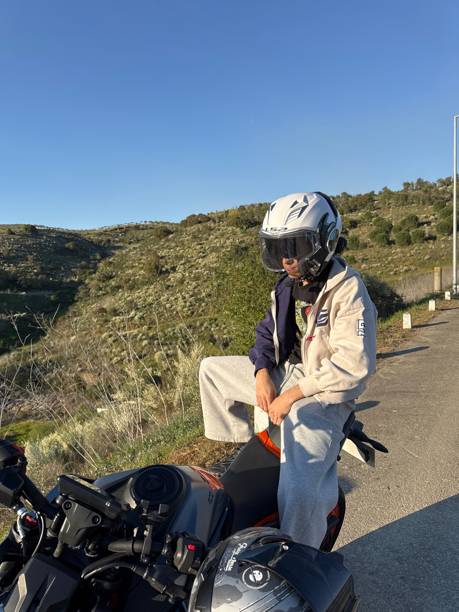 A person wearing a white helmet and a light-colored hoodie is seated on a motorcycle on a paved road. Another helmet is placed on the fuel tank of the motorcycle. The background consists of a hillside…read more