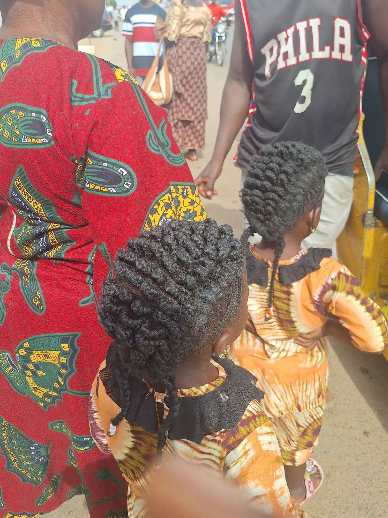Two African women with braided hair are lying next to each other. One is wearing a red and yellow patterned dress, and the other is wearing an orange patterned dress with a black lace collar. A man we…read more