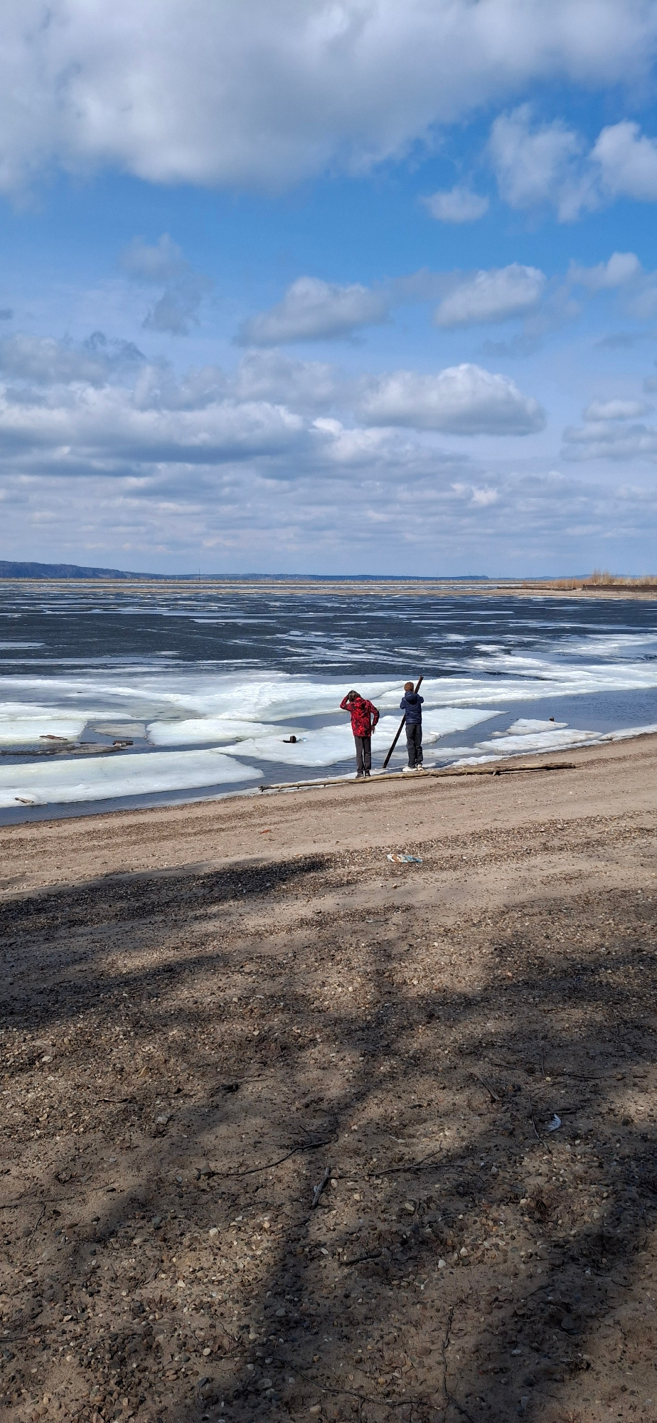 An outdoor scene captures two individuals standing at the edge of a partially frozen body of water in Chaikovsky, Russia, likely during a cold season such as winter or early spring. The sky is a vivid…read more