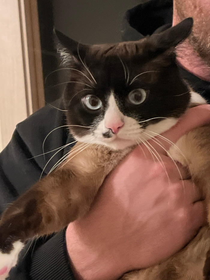 A tuxedo cat with a pink nose and striking blue eyes is held upside down. The cat's head is tilted, creating an amusing expression. A person's hand and arm cradle the cat, with their skin visible in t…read more