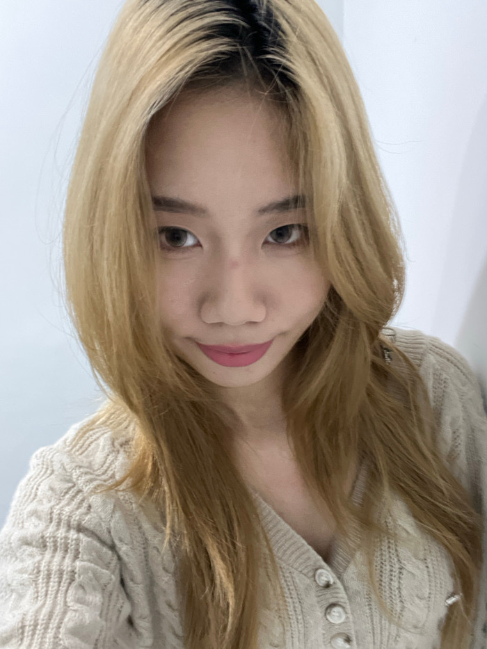 The image displays a close-up, head-and-shoulders portrait of an East Asian female located in Yuzhong District, China. The subject has long, layered, golden-blonde hair with visible dark roots. Her li…read more