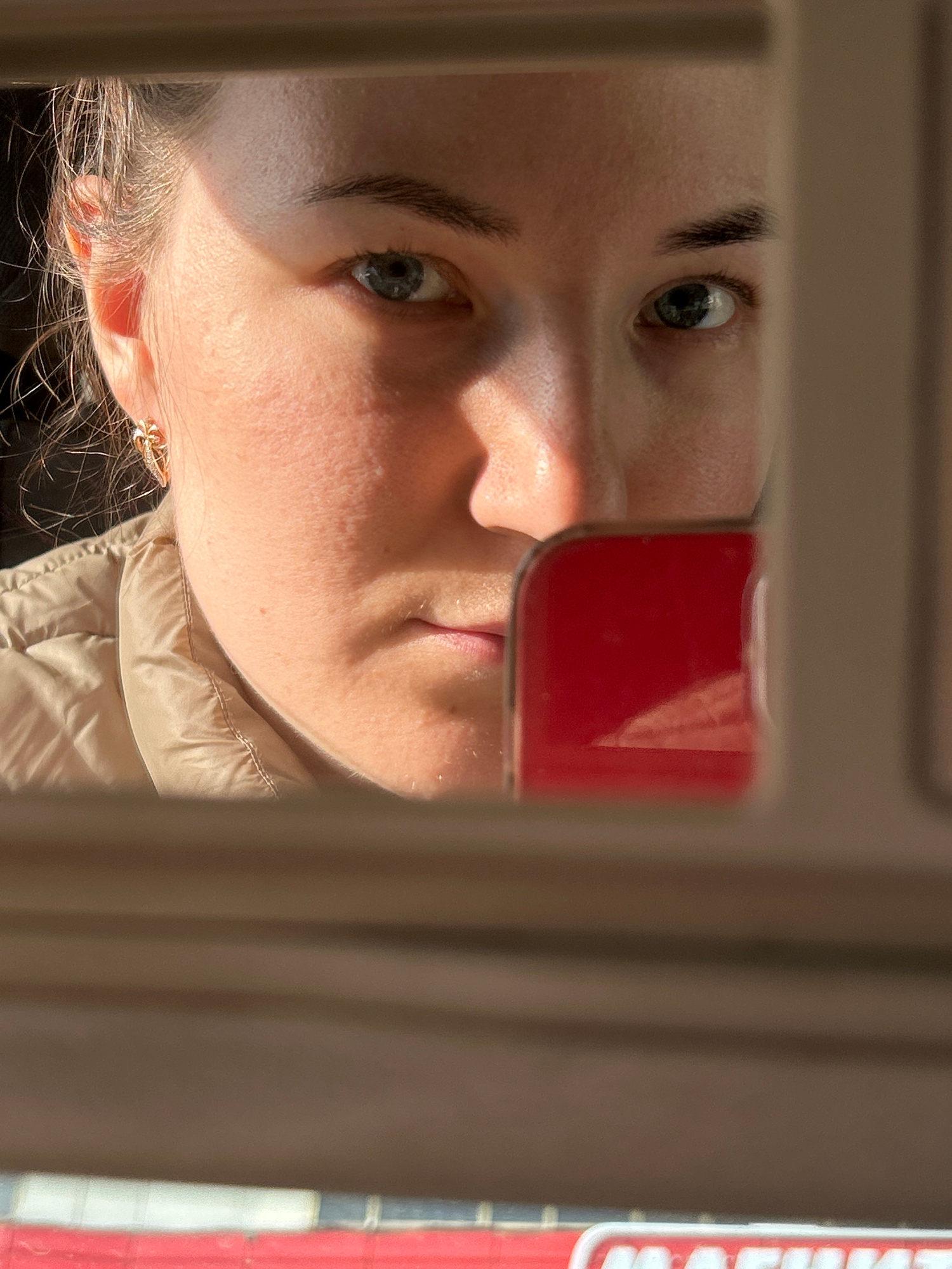The image is a close-up, horizontally oriented portrait of a person's face, rotated 90 degrees clockwise from a typical upright view. The subject is a person, likely female, with fair skin, dark eyebr…read more