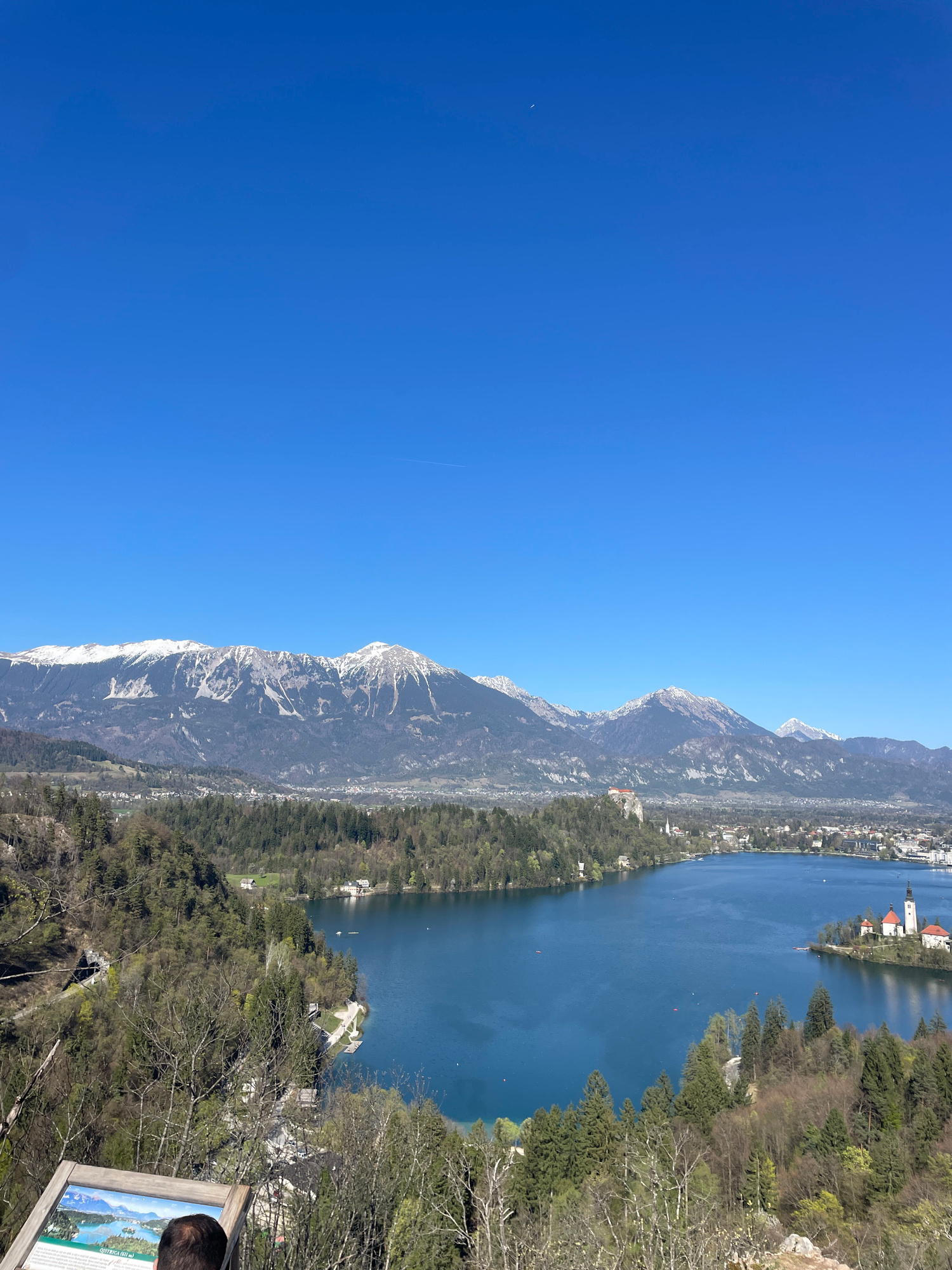 The image captures a panoramic view of Lake Bled in Slovenia. The lake's deep blue water is bordered by lush greenery and the town of Bled. In the distance, snow-capped mountains loom against a clear,…read more