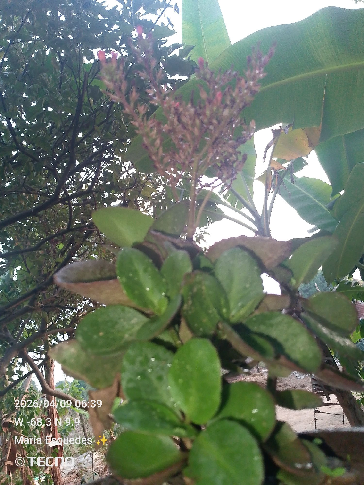 The image shows a plant with green, glossy leaves and a reddish-brown flower spike. A banana tree is visible in the background, as well as other trees with dense foliage. The date, time, and location…read more