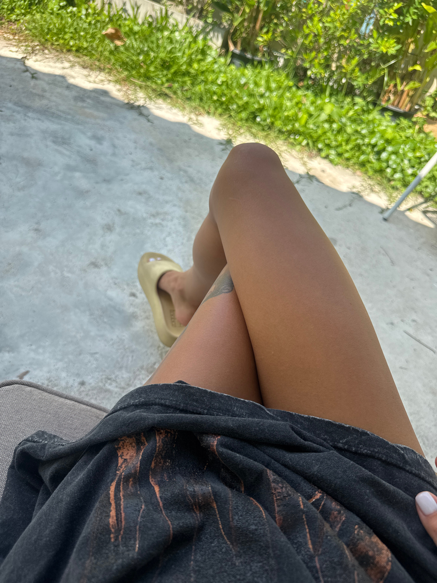 The image, taken from a high angle, shows a person's legs and part of their torso. The person is wearing a dark-colored, possibly tie-dyed, garment that covers their lap. Their legs are bare, and they…read more