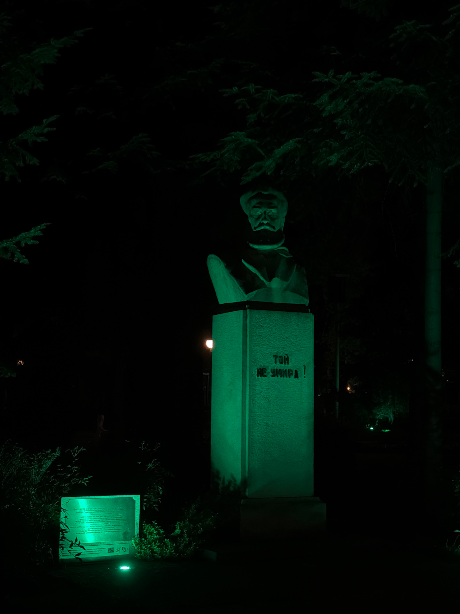 The image captures a night scene in Plovdiv, Bulgaria, dominated by a statue illuminated with an artificial green light. The statue, depicting a man with a cap and beard, stands on a rectangular plint…read more