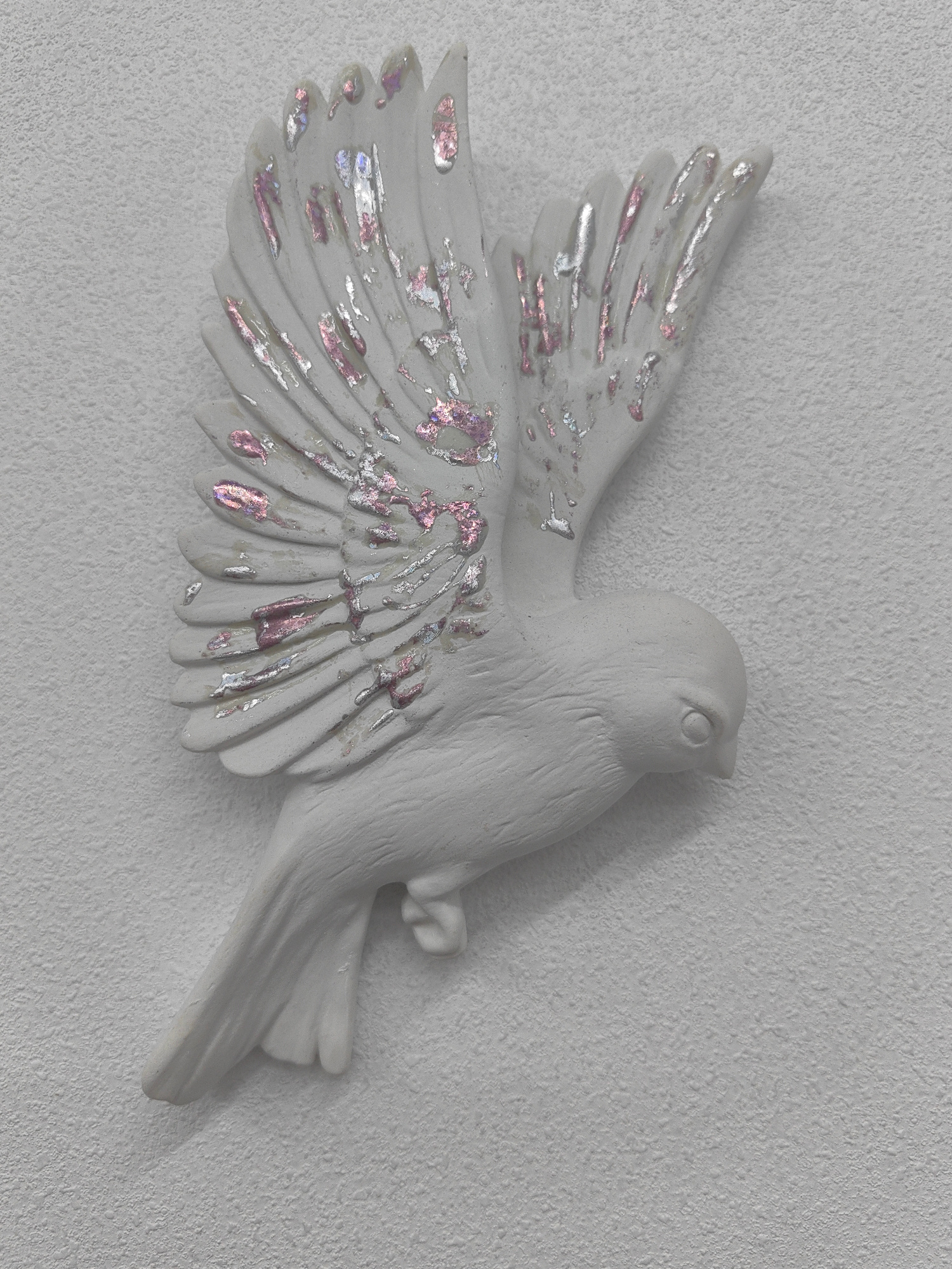 A plaster bird figurine is mounted on a light gray textured wall. The bird is white and has a glittery iridescent pattern on its wings. The bird is depicted with its wings spread as if it is in flightβ¦read more