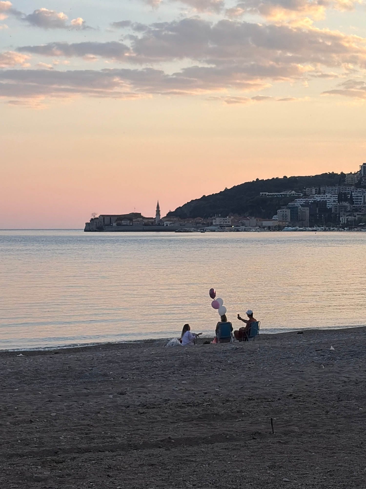 The photograph shows a coastal scene in Budva, Montenegro, at sunset. The sky is streaked with pink and pale orange light, partly obscured by clouds. To the left of the frame, a hillside rises, topped…read more