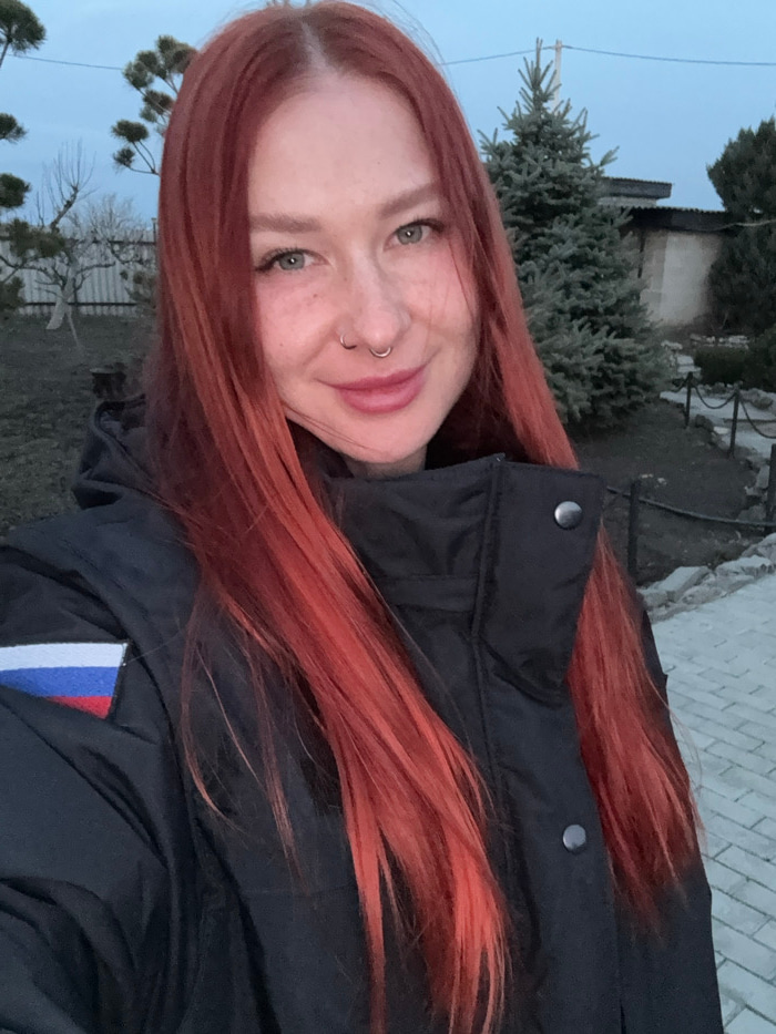 A female subject with long, reddish-orange hair, light-colored eyes, visible freckles, and a septum piercing is depicted in a frontal, chest-up outdoor portrait. She exhibits a faint smile. She is wea…read more