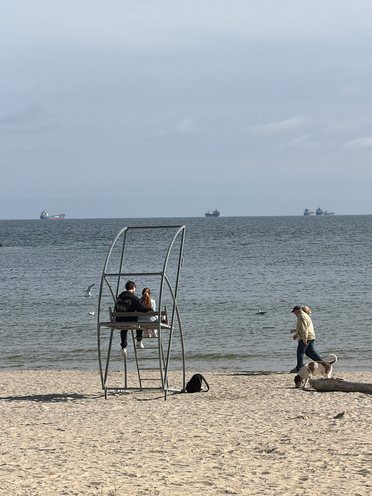 This image captures a vibrant beach scene in Varna, Bulgaria, on a clear, bright day. The foreground features a wide stretch of light-colored sand, meeting a calm, expansive body of water, likely the…read more