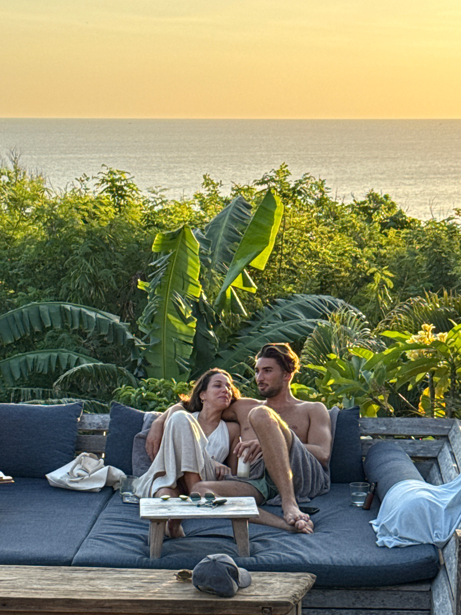 A man and a woman are embracing on a cushioned outdoor lounge sofa with glasses, sunglasses, and a hat on a small table in front of them. The background includes lush tropical vegetation and a view of…read more