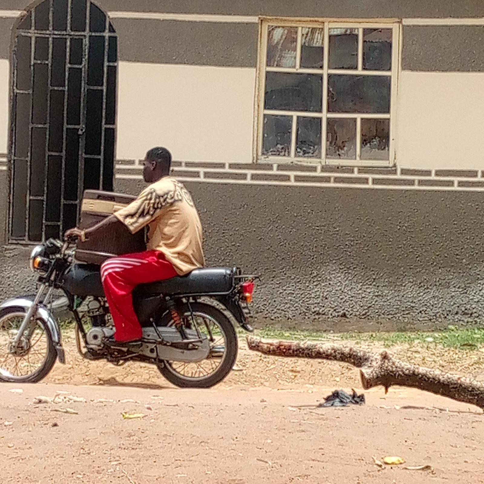 A man rides a black motorcycle on a dirt road in an unspecified city in Unknown. He wears a tan patterned shirt and red sweatpants with white stripes. He carries a brown rectangular object on the moto…read more