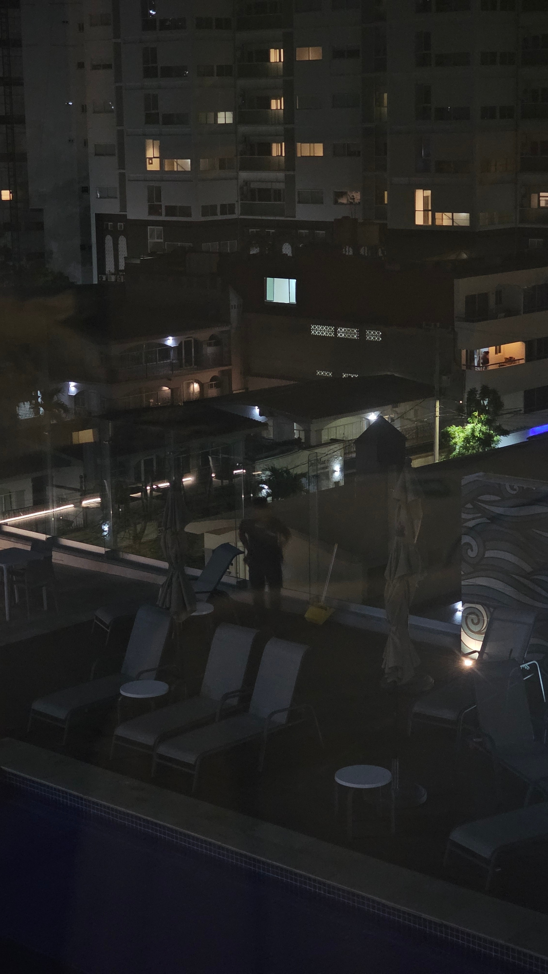 The image depicts an outdoor scene at night, possibly from a high vantage point overlooking a city. Buildings with multiple lit windows dominate the left side, suggesting an urban setting. There are uā¦read more