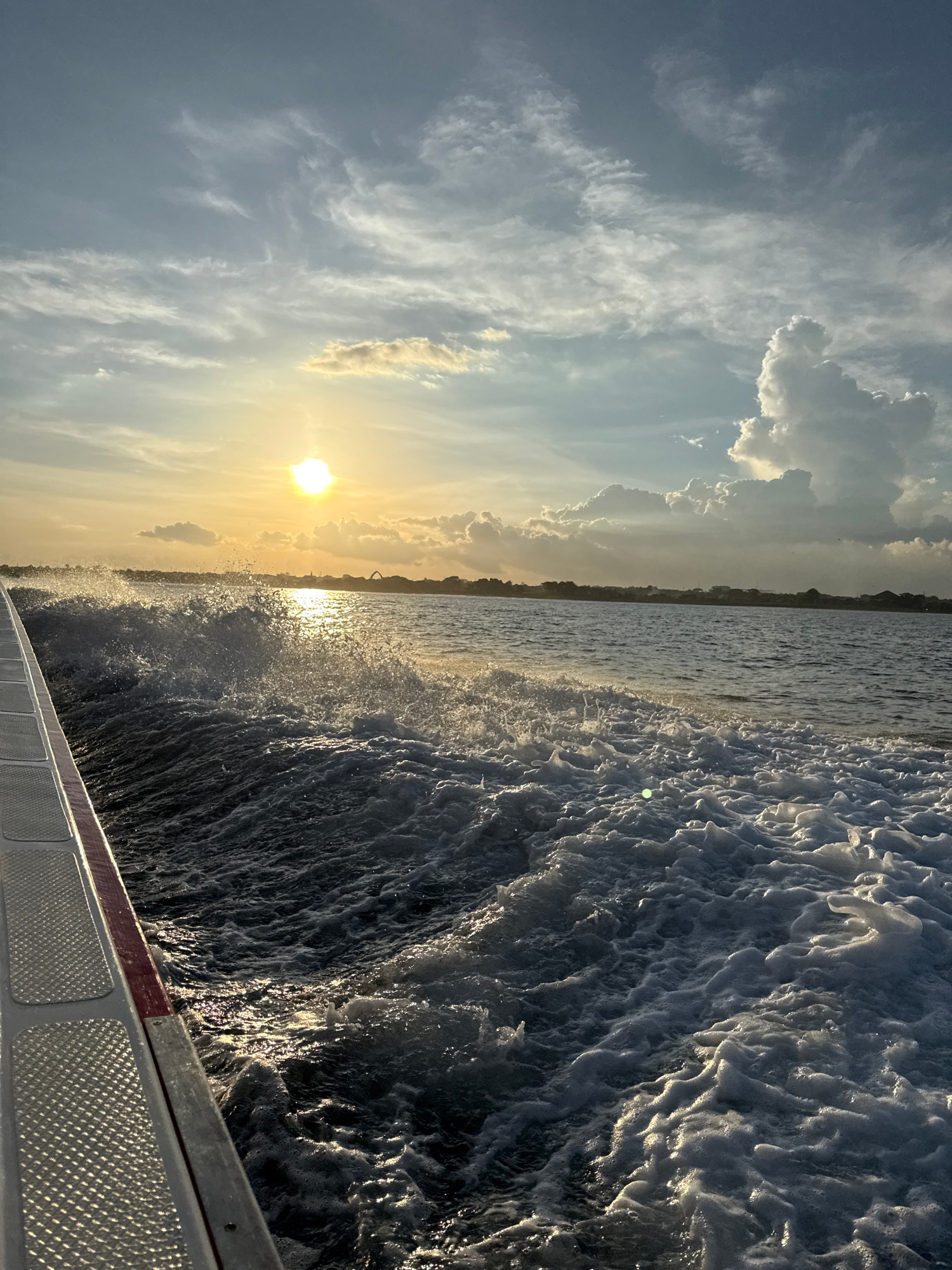 The image captures a vibrant sunset scene from the perspective of a moving boat on the water. The sun, a brilliant yellowish-orange orb, is low on the horizon, creating a luminous glow that dominates…read more