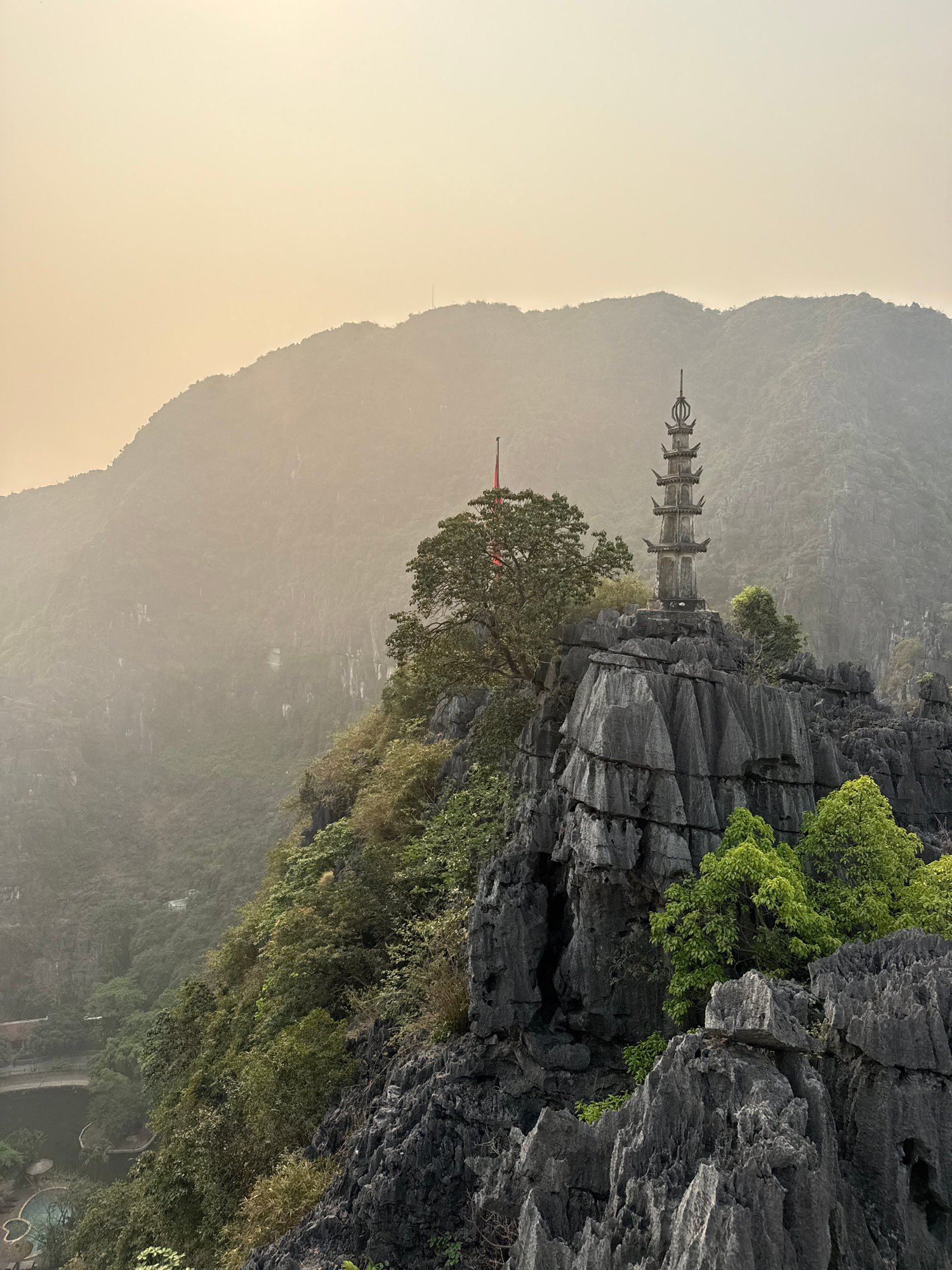 The image shows a pagoda perched atop a rocky cliff in Nam Hoa Lư Ward, Vietnam. The pagoda is a multi-tiered structure with intricate details. The cliff is composed of dark, jagged rocks with patches…read more