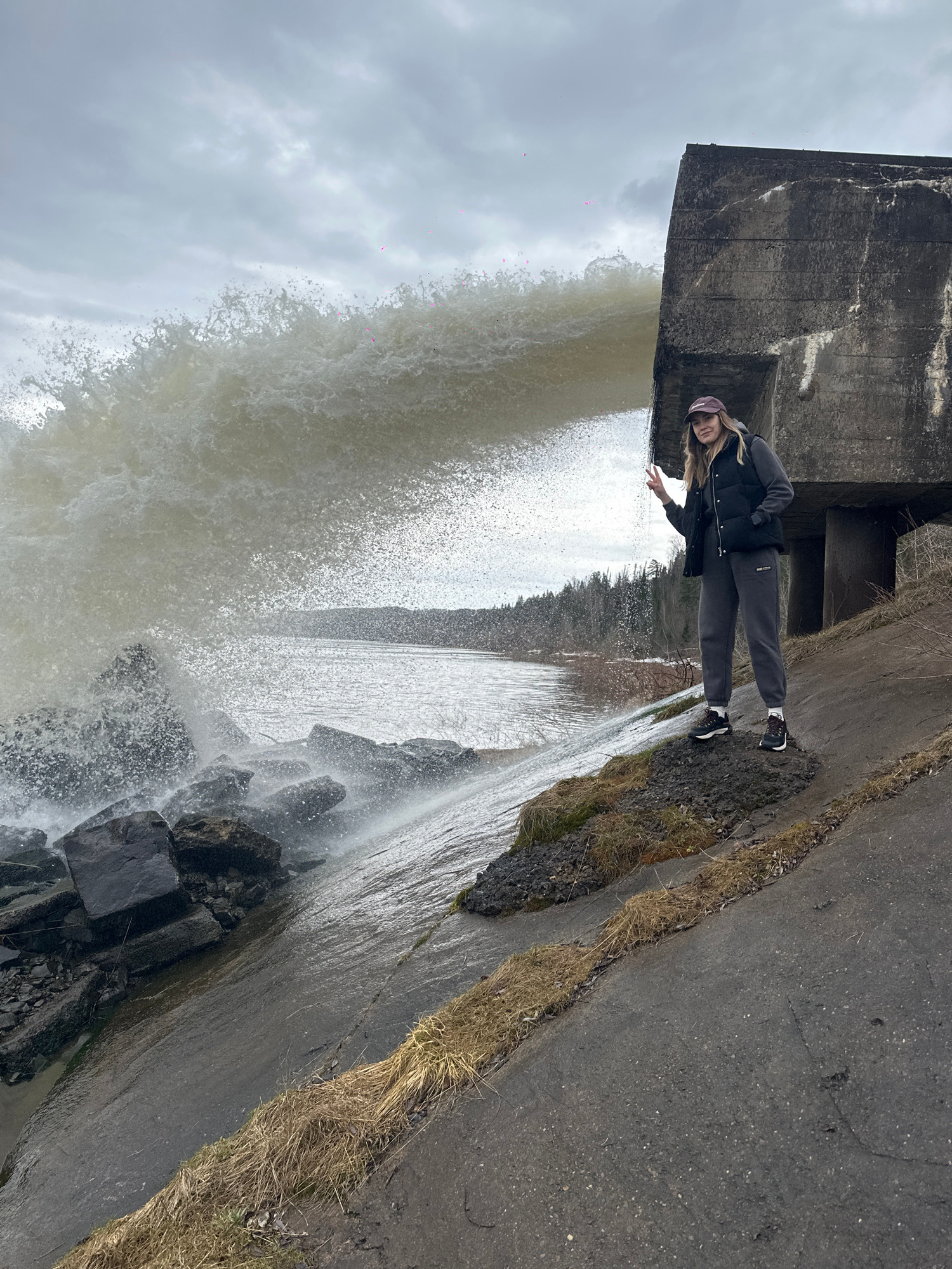 A woman stands on a concrete structure near a waterfall in what appears to be an outdoor setting. She is wearing a dark-colored vest, gray sweatpants, and sneakers, with a purple baseball cap on her h…read more