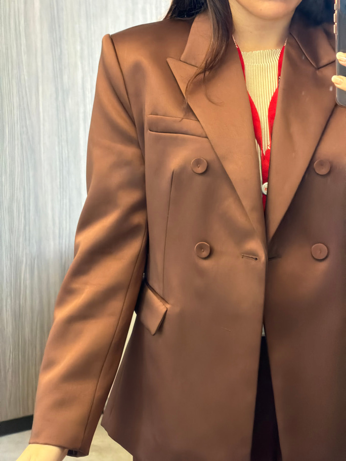 A person is wearing a brown double-breasted blazer over a striped red and white top. The blazer features prominent buttons, a welt pocket, and structured shoulder pads. The fabric has a slight sheen,…read more