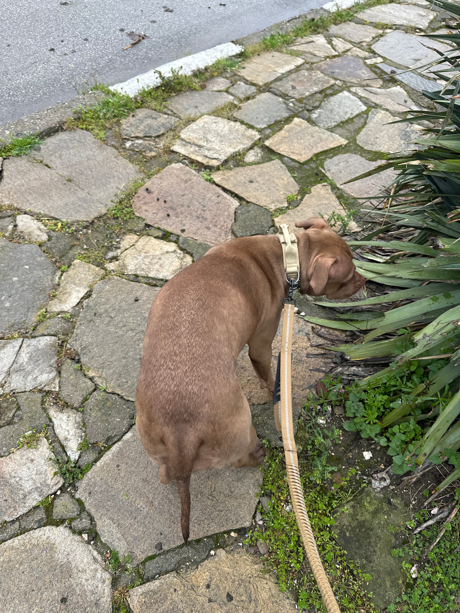 A brown dog lies on a stone-paved surface, possibly a sidewalk or pedestrian area. The dog is wearing a light-colored collar and is attached to a leash. Adjacent to the paved area is a patch of greene…read more