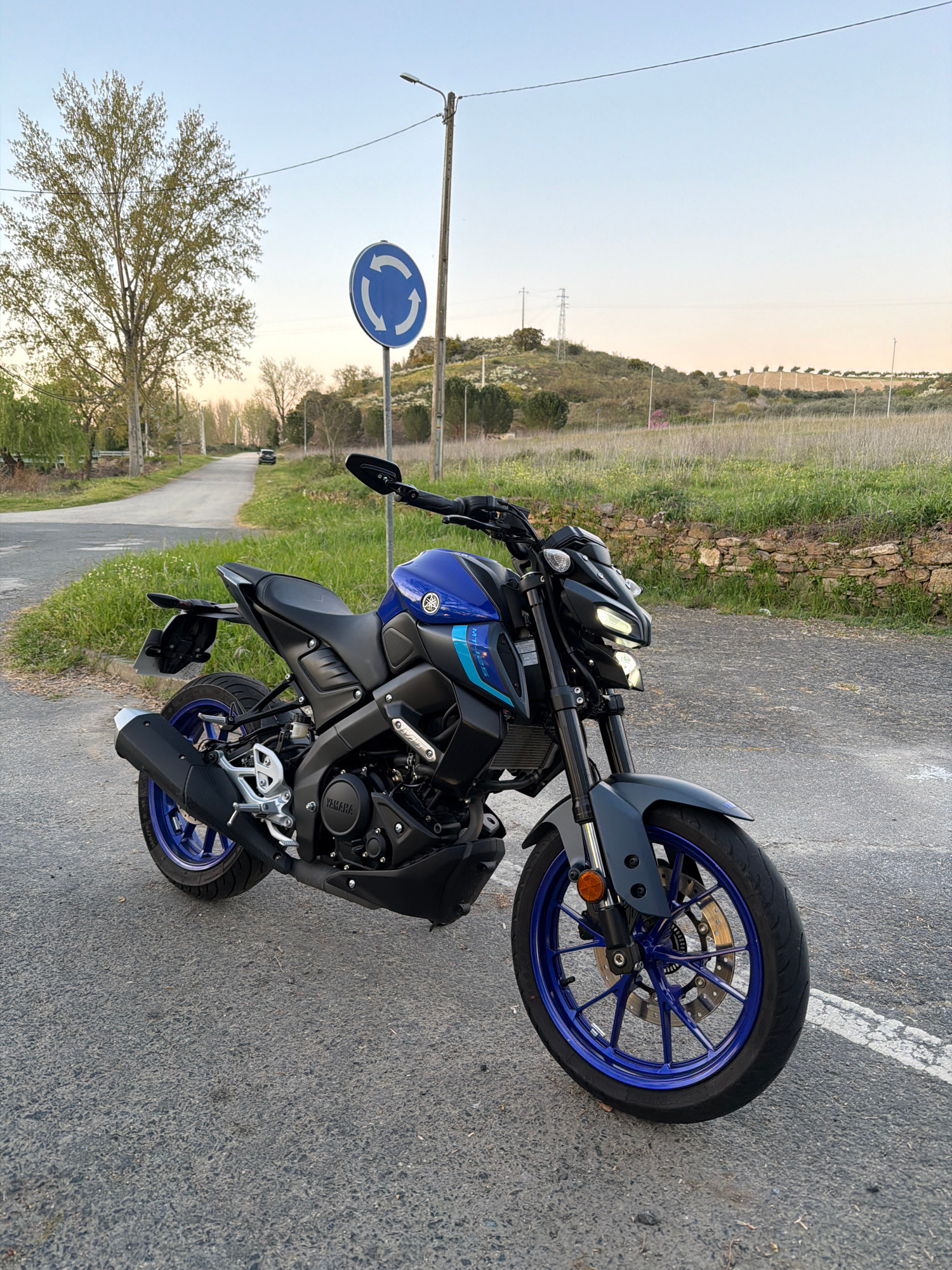 The image depicts a blue and black Yamaha MT-125 motorcycle parked on the side of a paved road. A roundabout traffic sign is visible in the background, along with a tree and a grassy area. The locatio…read more