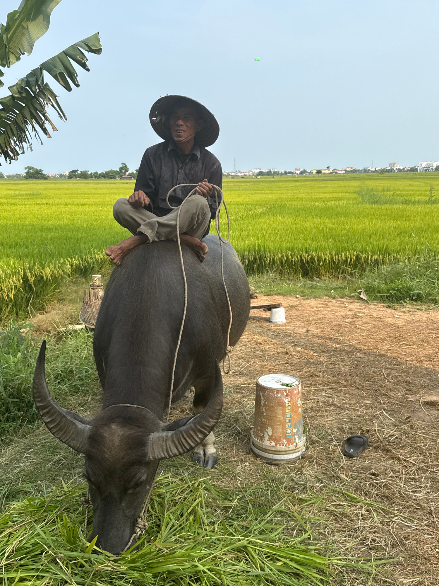 An older man rides a dark water buffalo in a rural Vietnamese landscape, likely Hội An Ward. He is seated barefoot on the animal's back, wearing a traditional straw hat, a dark long-sleeved shirt, and…read more