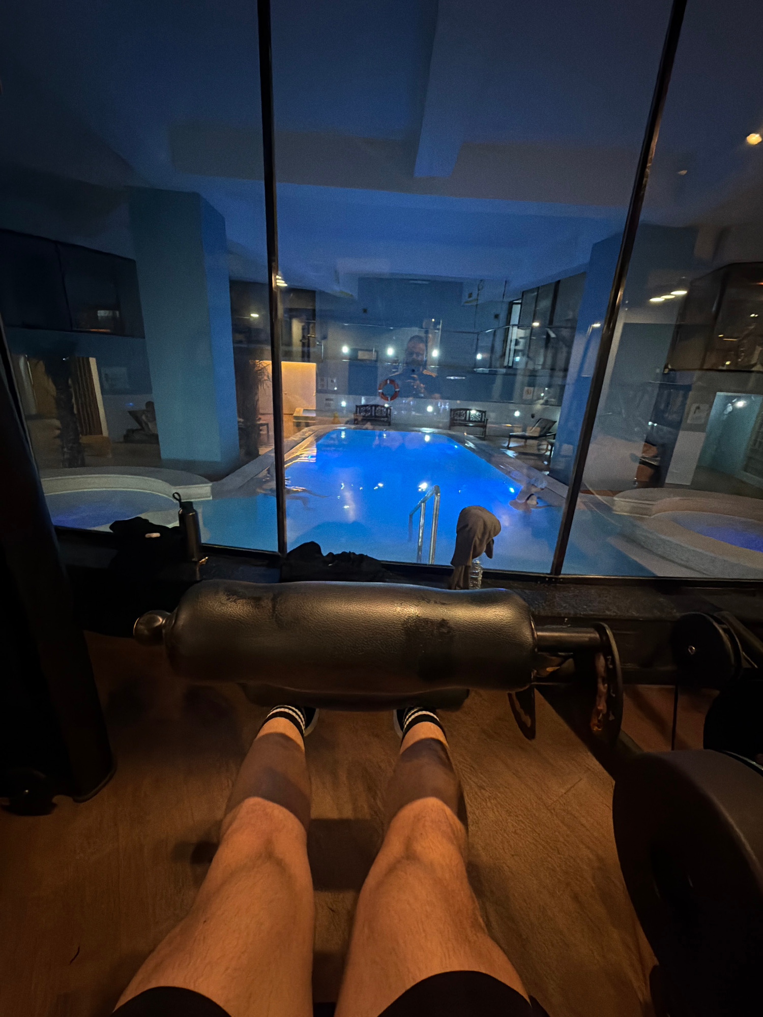 The image shows a view from a fitness facility overlooking an indoor pool in Sliema, Malta. Reflections on the glass suggest a high-rise setting. A person's legs and a piece of gym equipment are visib…read more