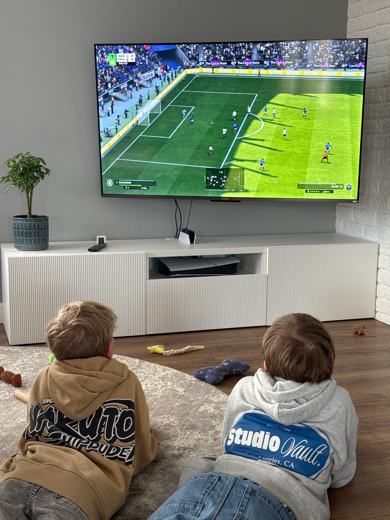 Two boys are lying on a rug, presumably watching a soccer game on a television. The TV is mounted on a gray wall above a white cabinet. The soccer game is between Germany and France. The first boy is…read more