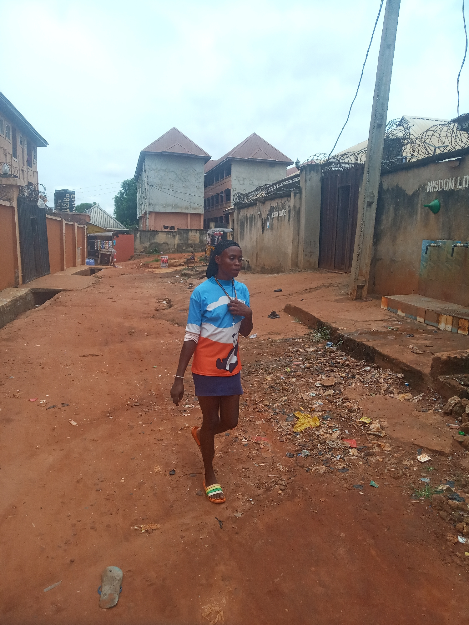 An eye-level, wide-shot photograph shows a narrow dirt road in Ukwu-Abwa, Nigeria. A woman walks along the road, wearing a blue, white, and orange shirt, a navy-blue skirt, and orange sandals with gre…read more