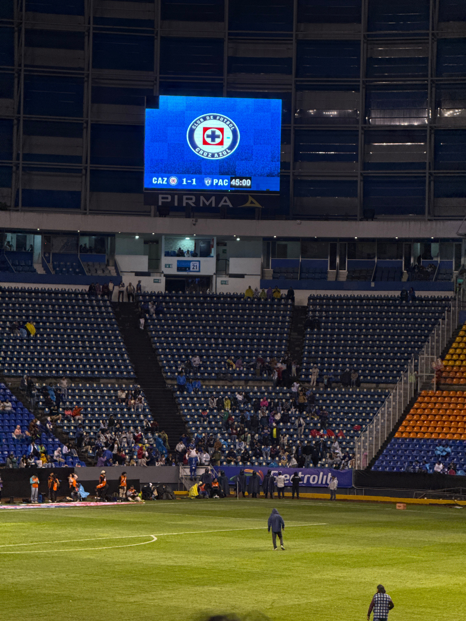 The image depicts a soccer stadium during a Cruz Azul vs. Pachuca game, likely in Puebla, Mexico. The score is tied 1-1 at the 45th minute. A large electronic scoreboard displays the Cruz Azul logo. S…read more