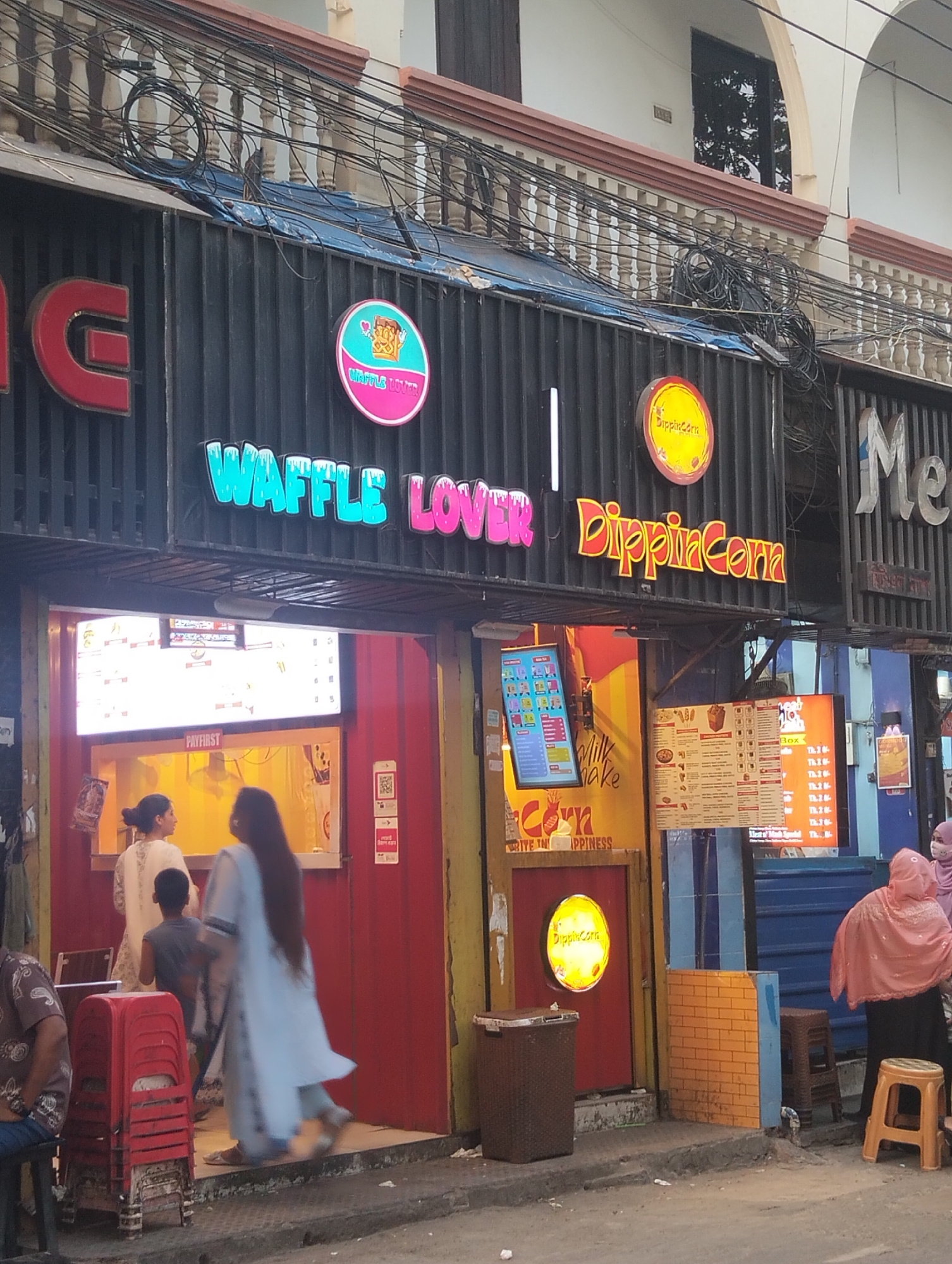 The image shows the storefront of "Waffle Lover | Dippin Corn" in Dhaka, Bangladesh. The store is located on a street with overhead electrical wires visible. The store front features signage in a mode…read more