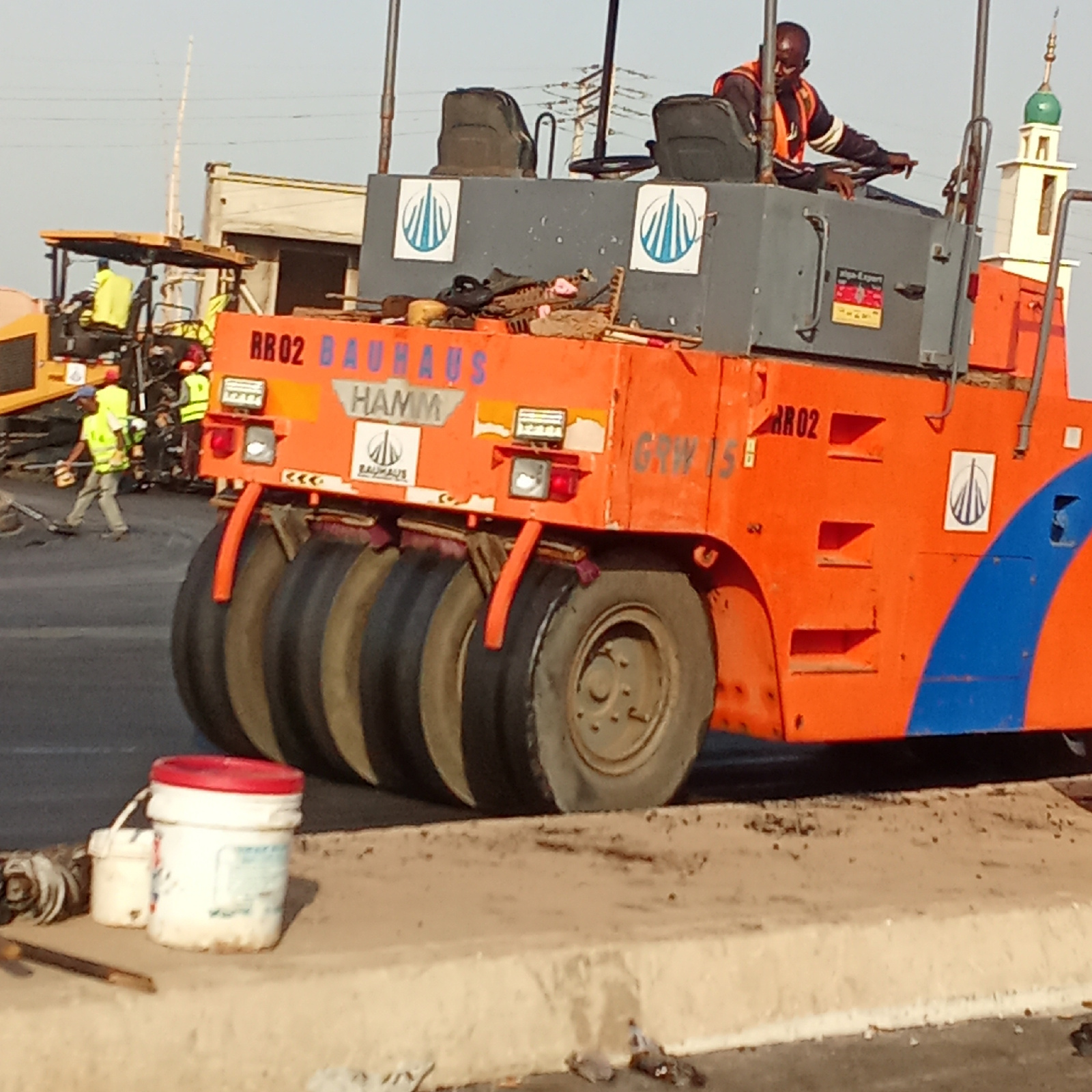 A wide shot shows a road paving construction project in Akwanga, Nigeria. An orange HAMM compactor with "RR02 BAUHAUS" in blue text on the back sits on a concrete road curb. The compactor is manned by…read more