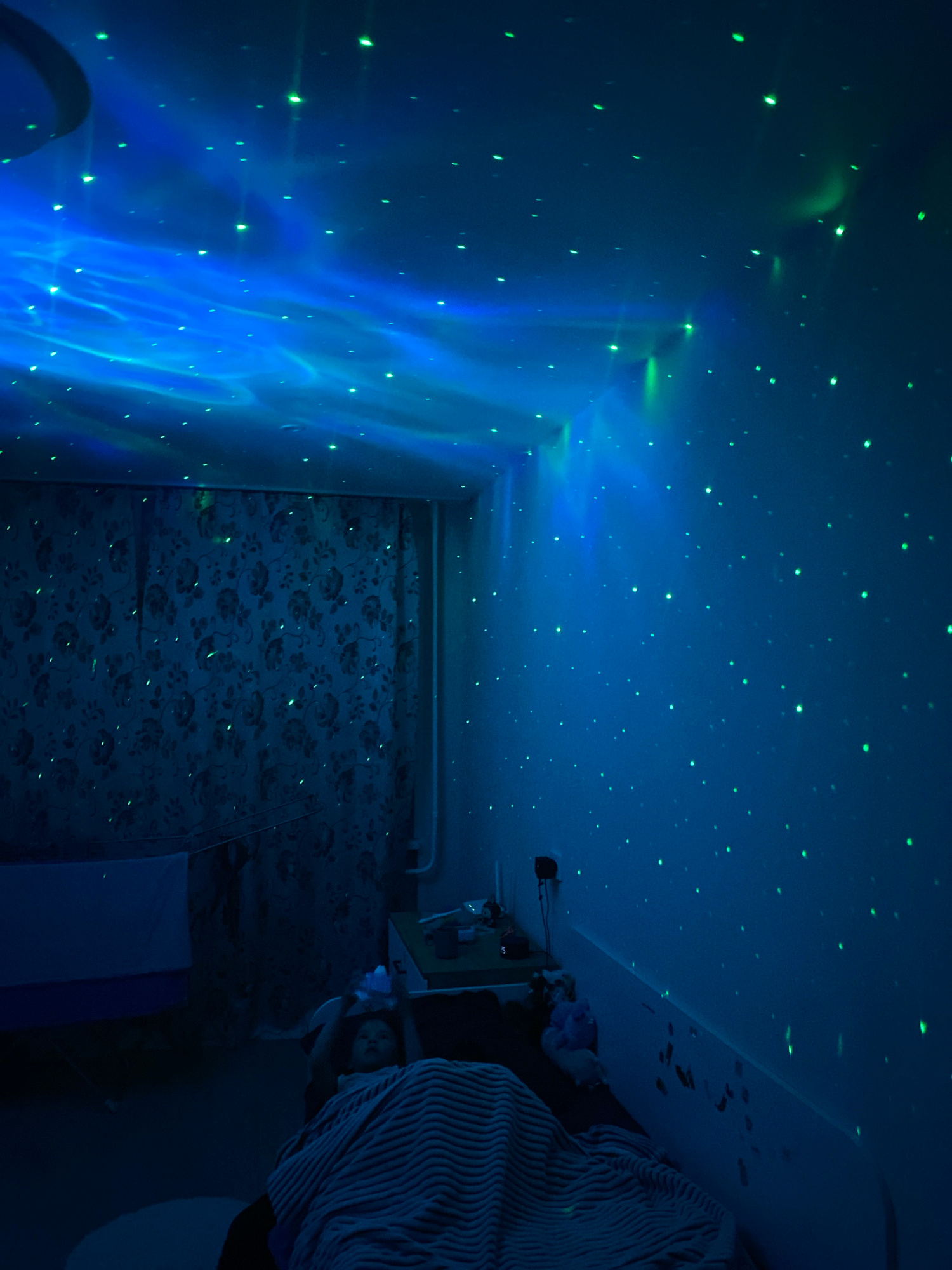 The image depicts a room illuminated by a star projector. The projection covers the ceiling and wall on the left with blue and green light. The wall displays a nebula effect with stars overlaid. A dif…read more